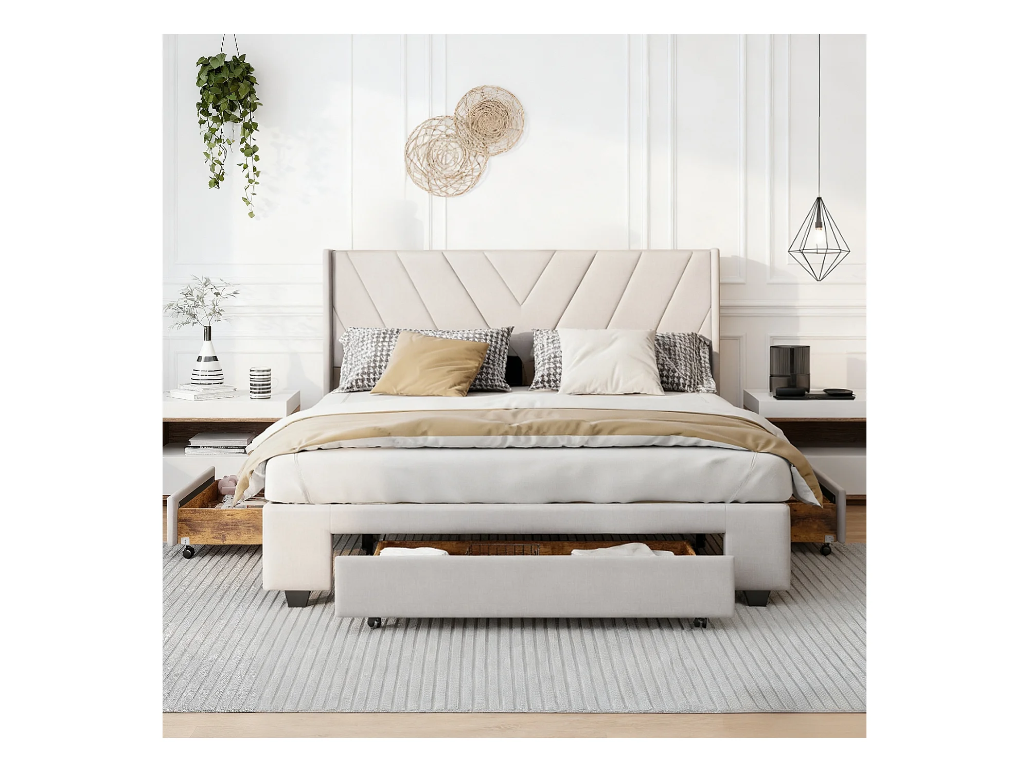 Lit 160x200 cm - NEXU - lit capitonné 160x200 cm tissu en lin - cadre lit tiroir 160x200 cm - lit adulte 160x200 cm avec sommier à lattes - beige