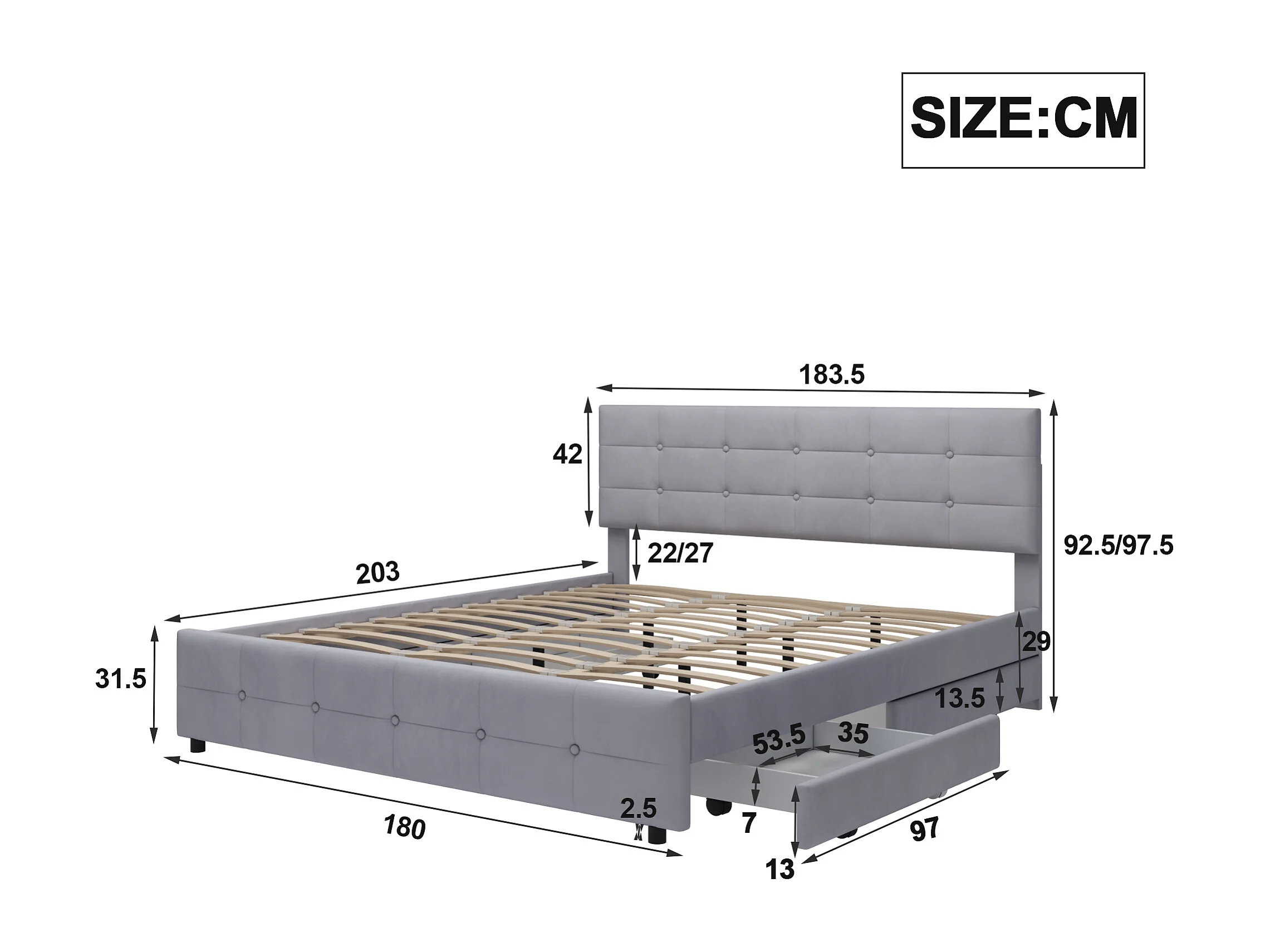 Lit 180 x 200 cm avec 4 tiroirs de rangement, tête de lit et sommier à lattes, tissu velours gris (203x183.5x97.5 cm)