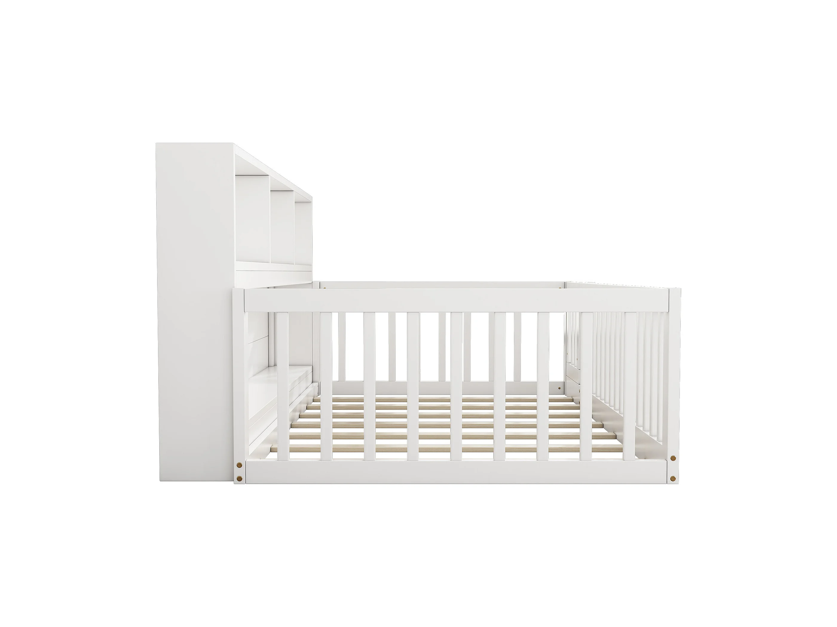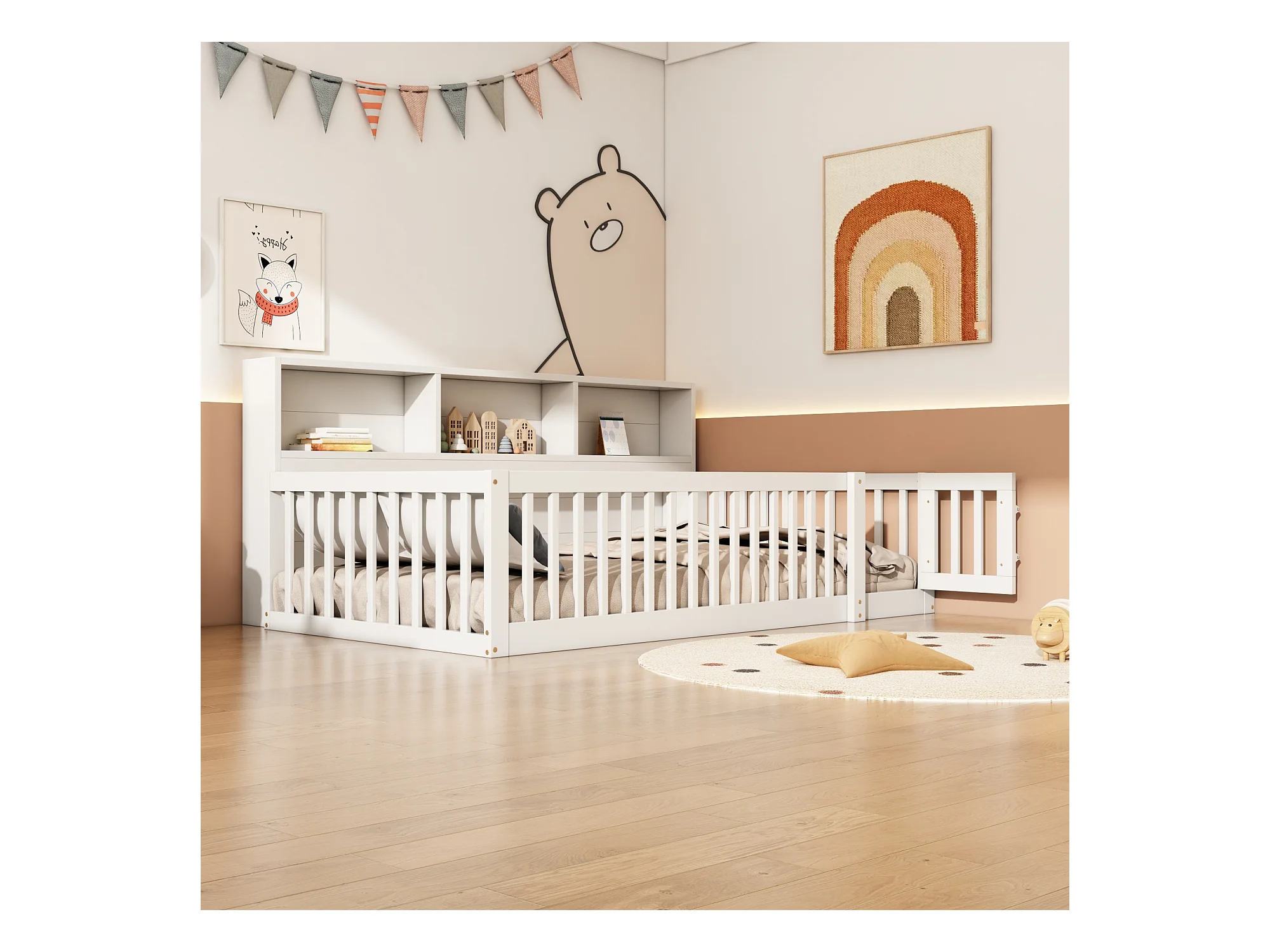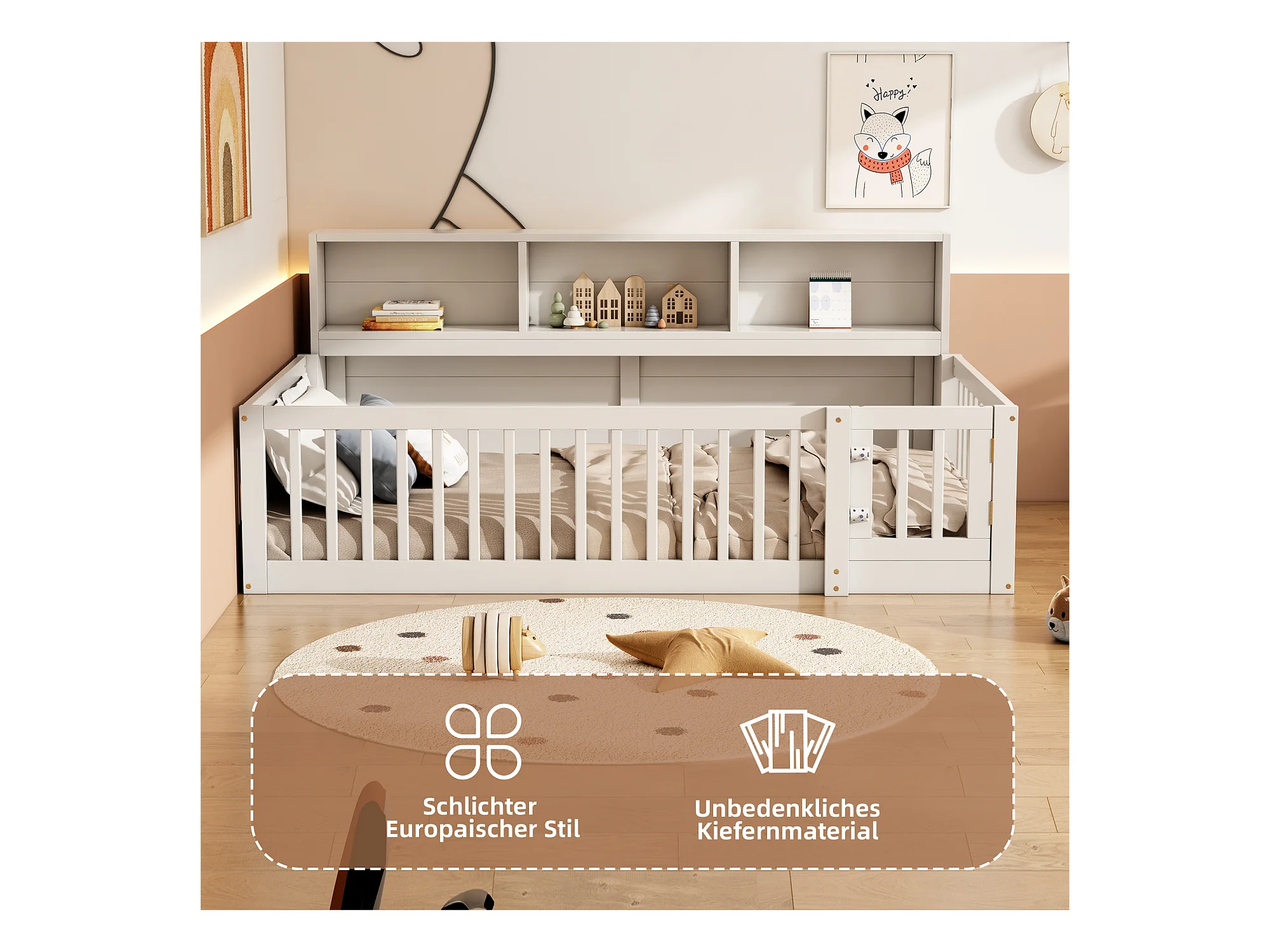 Lit 90 x 200 cm avec barrières et placards de rangement - Bois de pin + MDF - Sommier à lattes - Blanc (sans matelas)