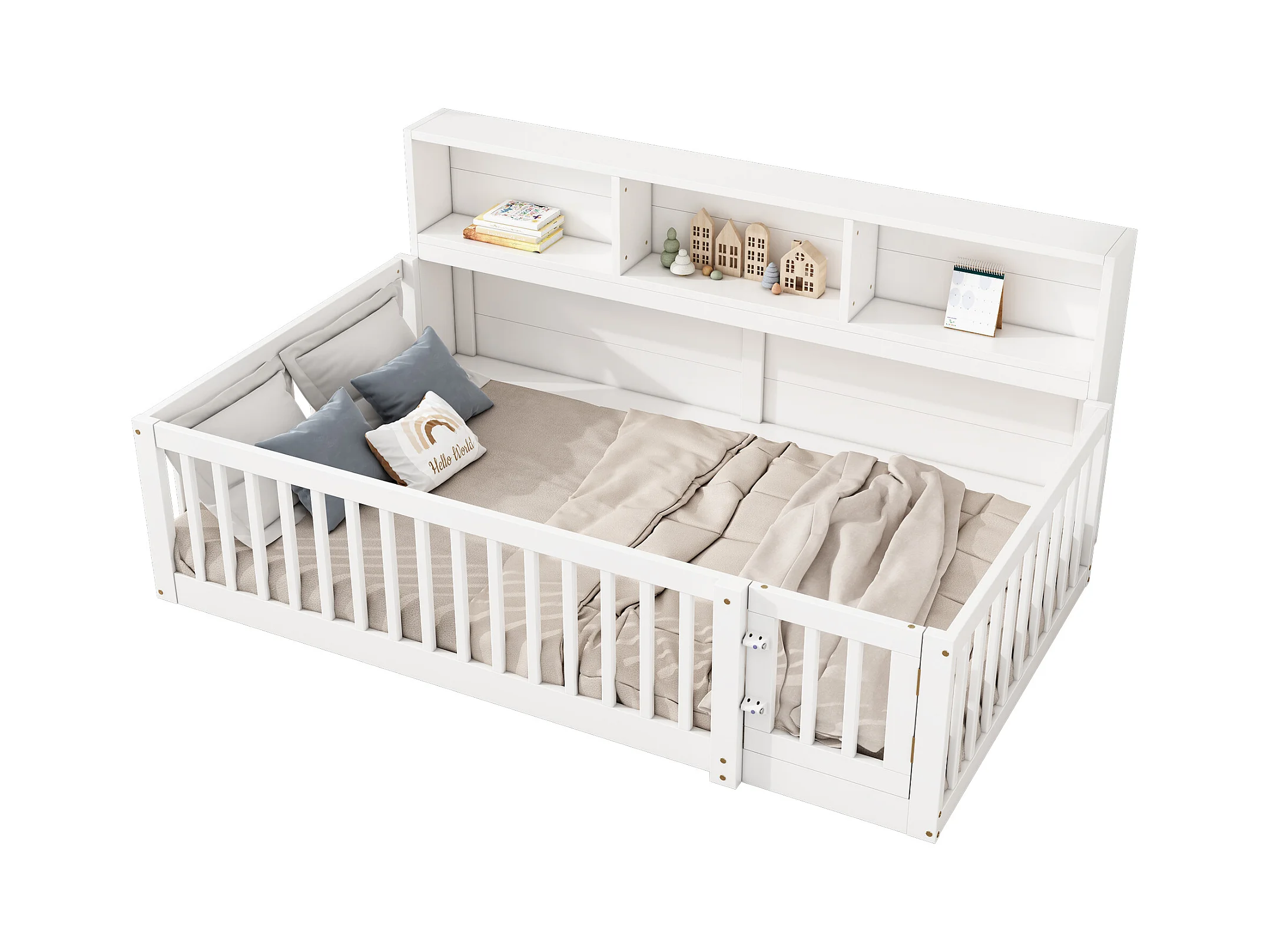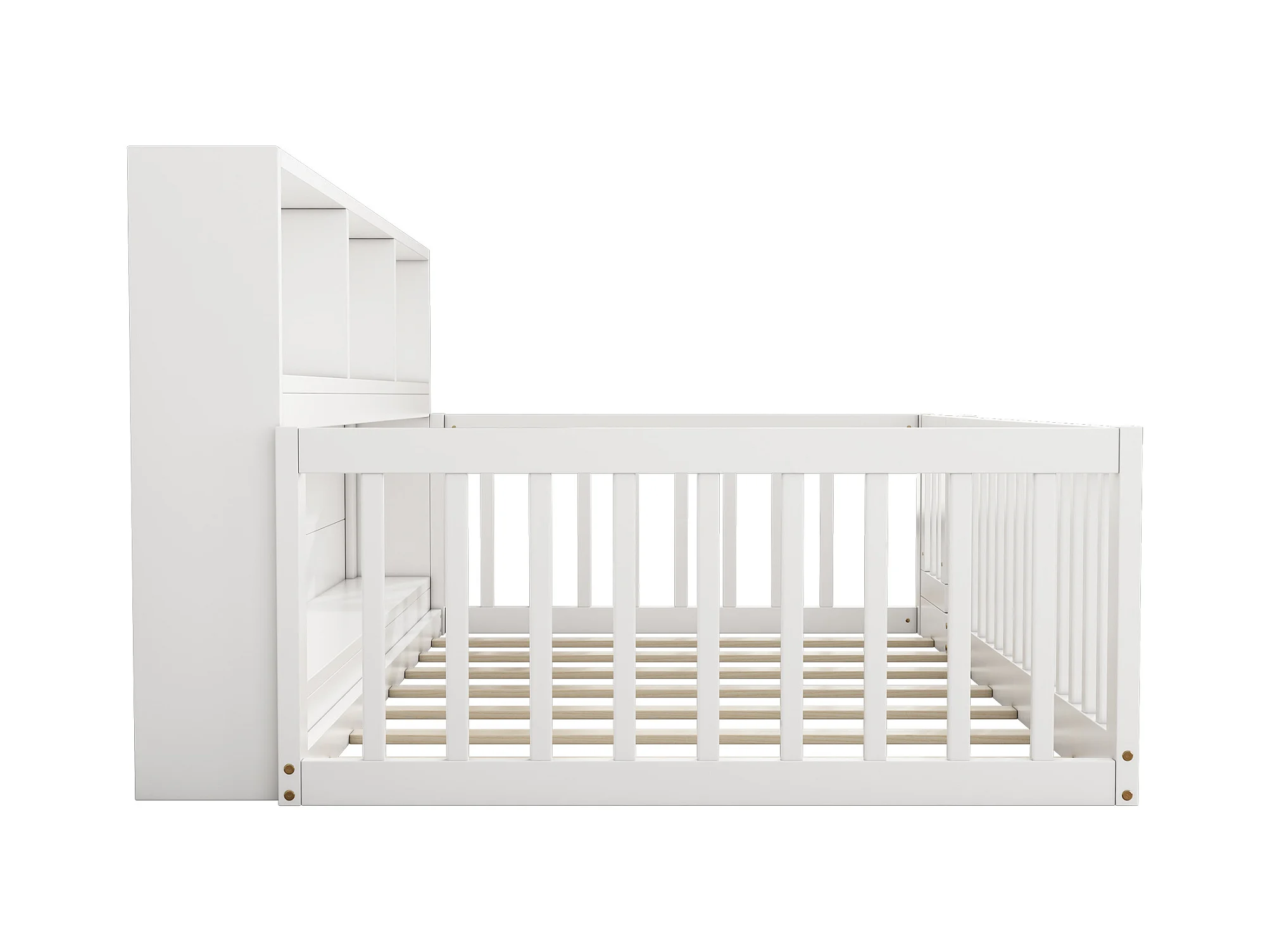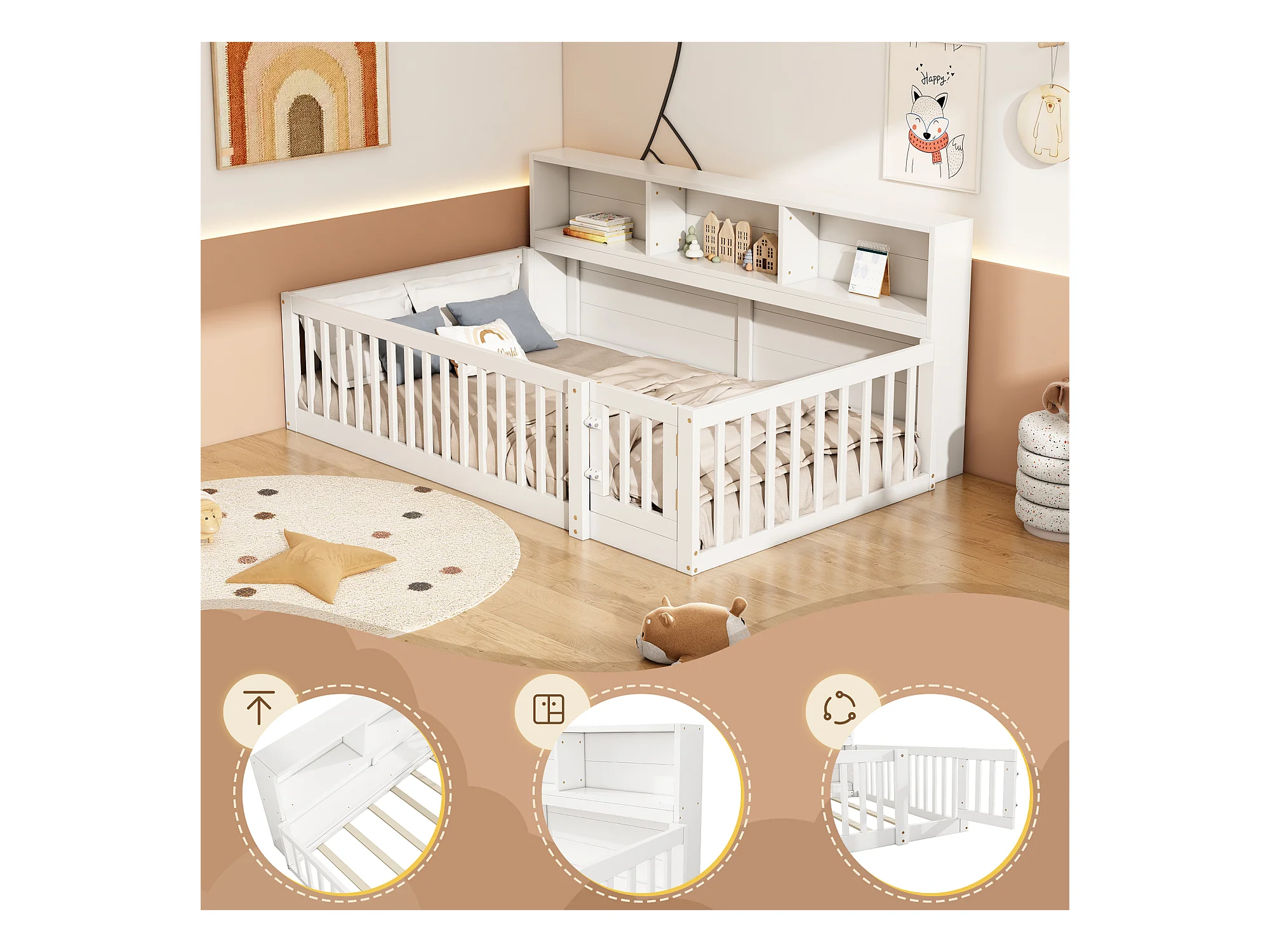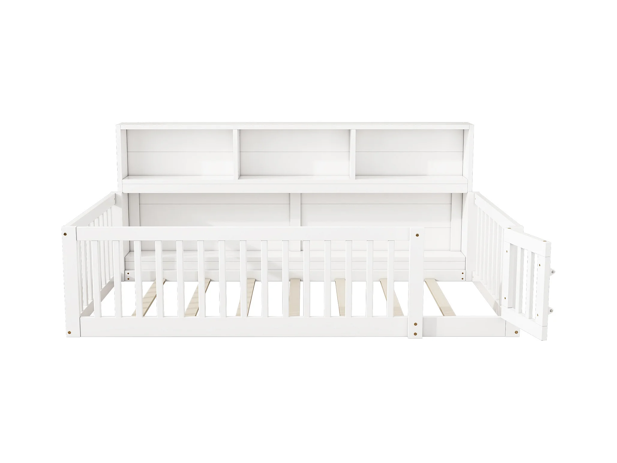 Lit 90 x 200 cm avec barrières et placards de rangement - Bois de pin + MDF - Sommier à lattes - Blanc (sans matelas)