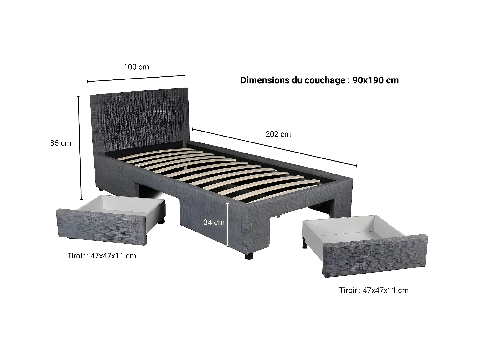 Lit LUGANO 90x190 + 1 sommier + 2 tiroirs / Gris foncé