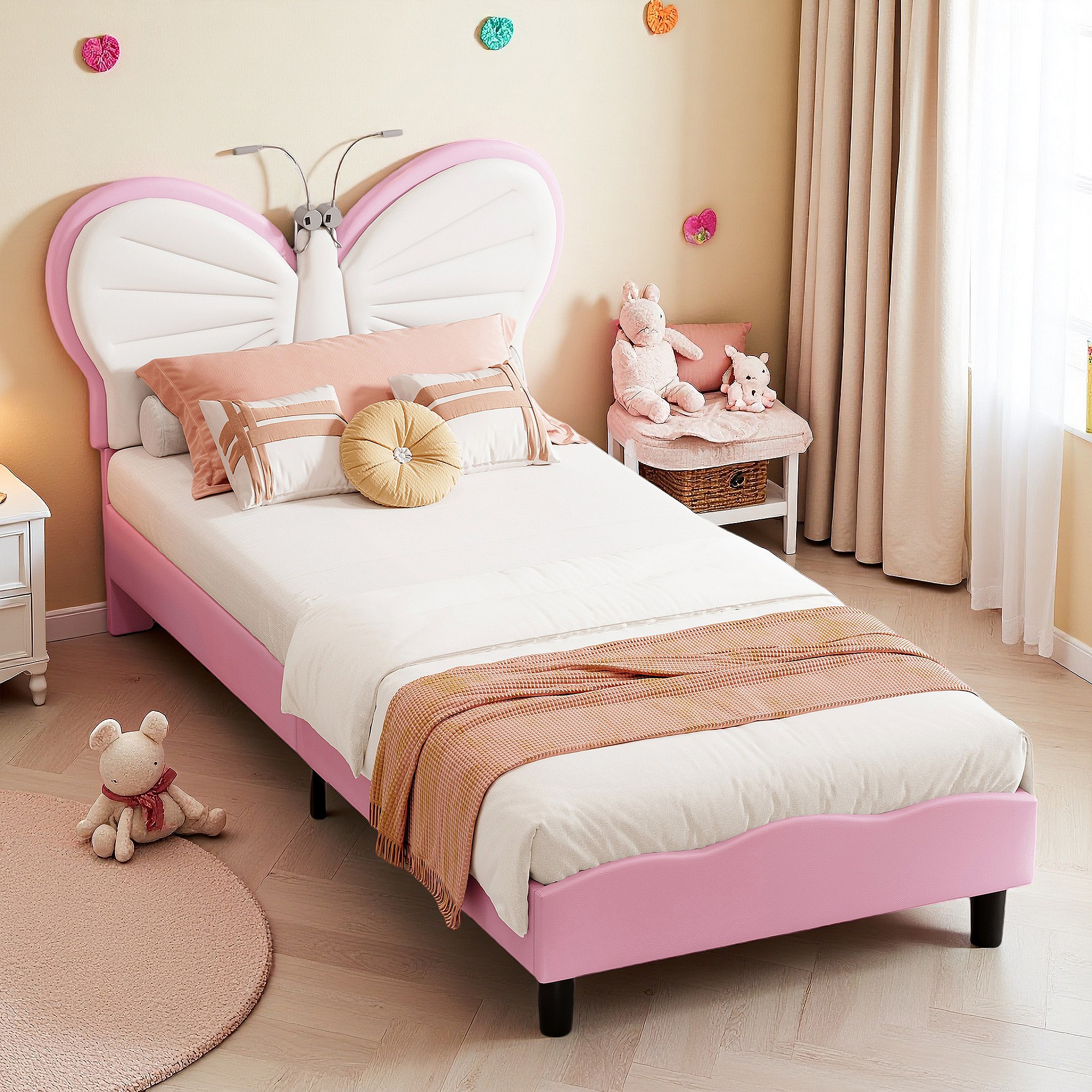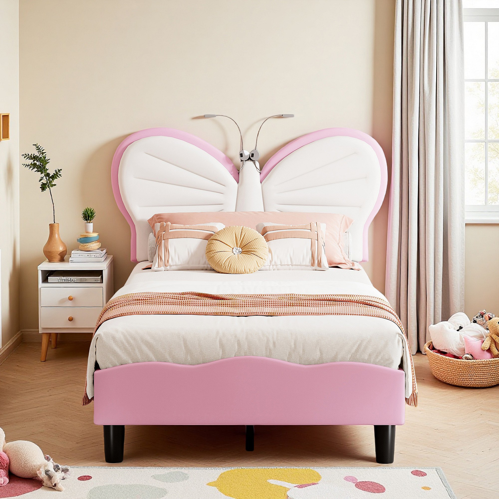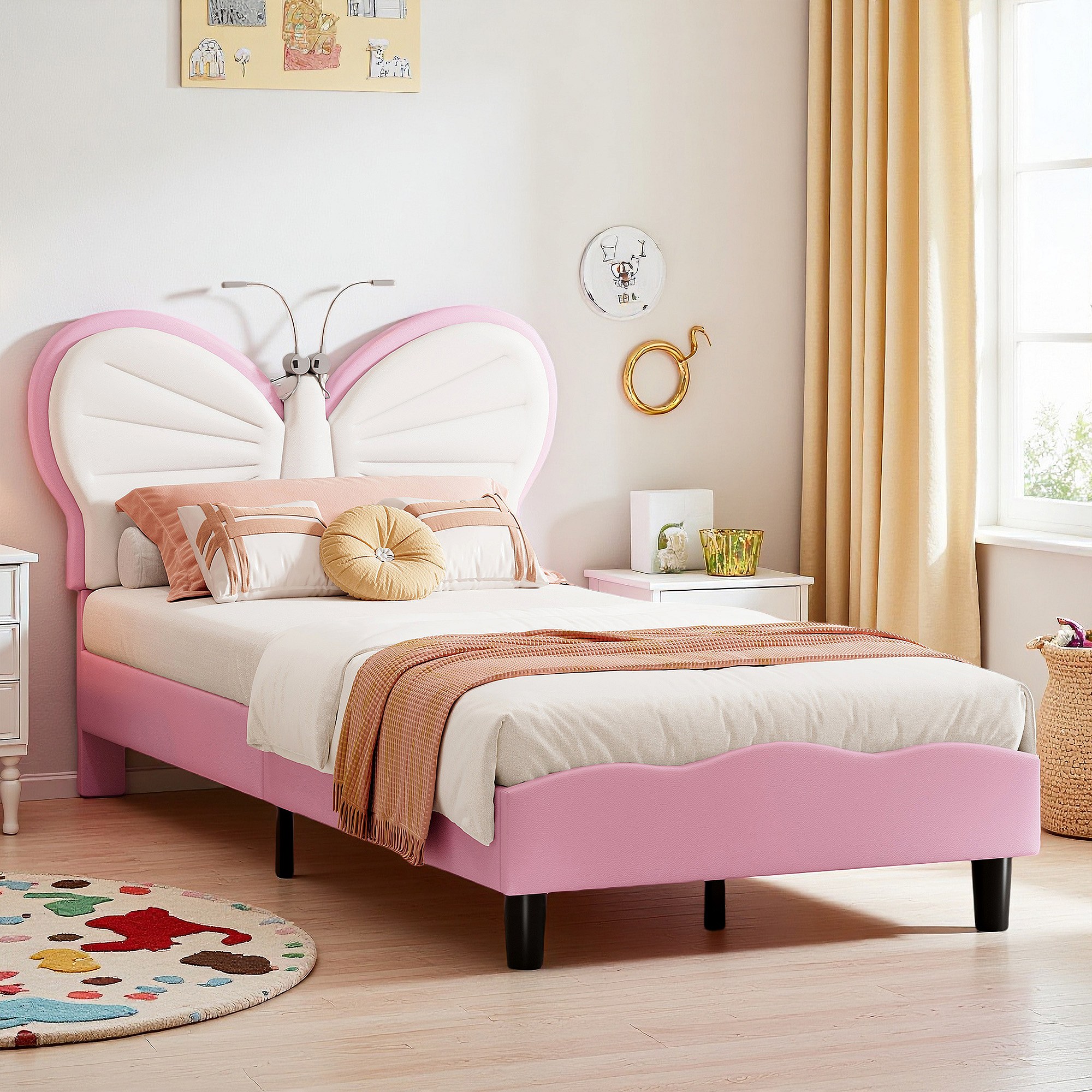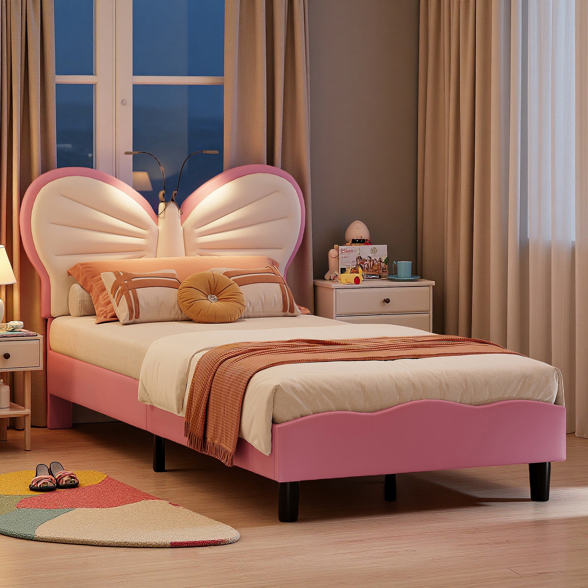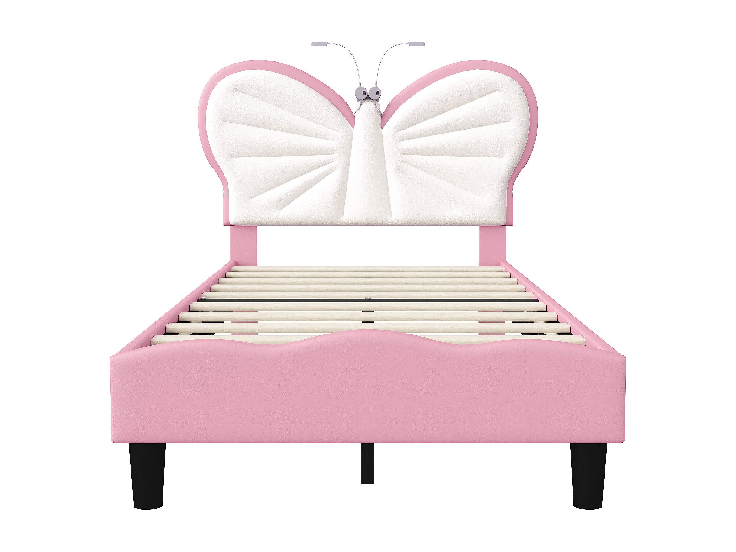 Lit 90x200 cm - NEXU - LED - lit enfant 90x200 cm - tissu en PU - forme papillon - cadre de lit fille 90x200 cm avec sommier à lattes - rose