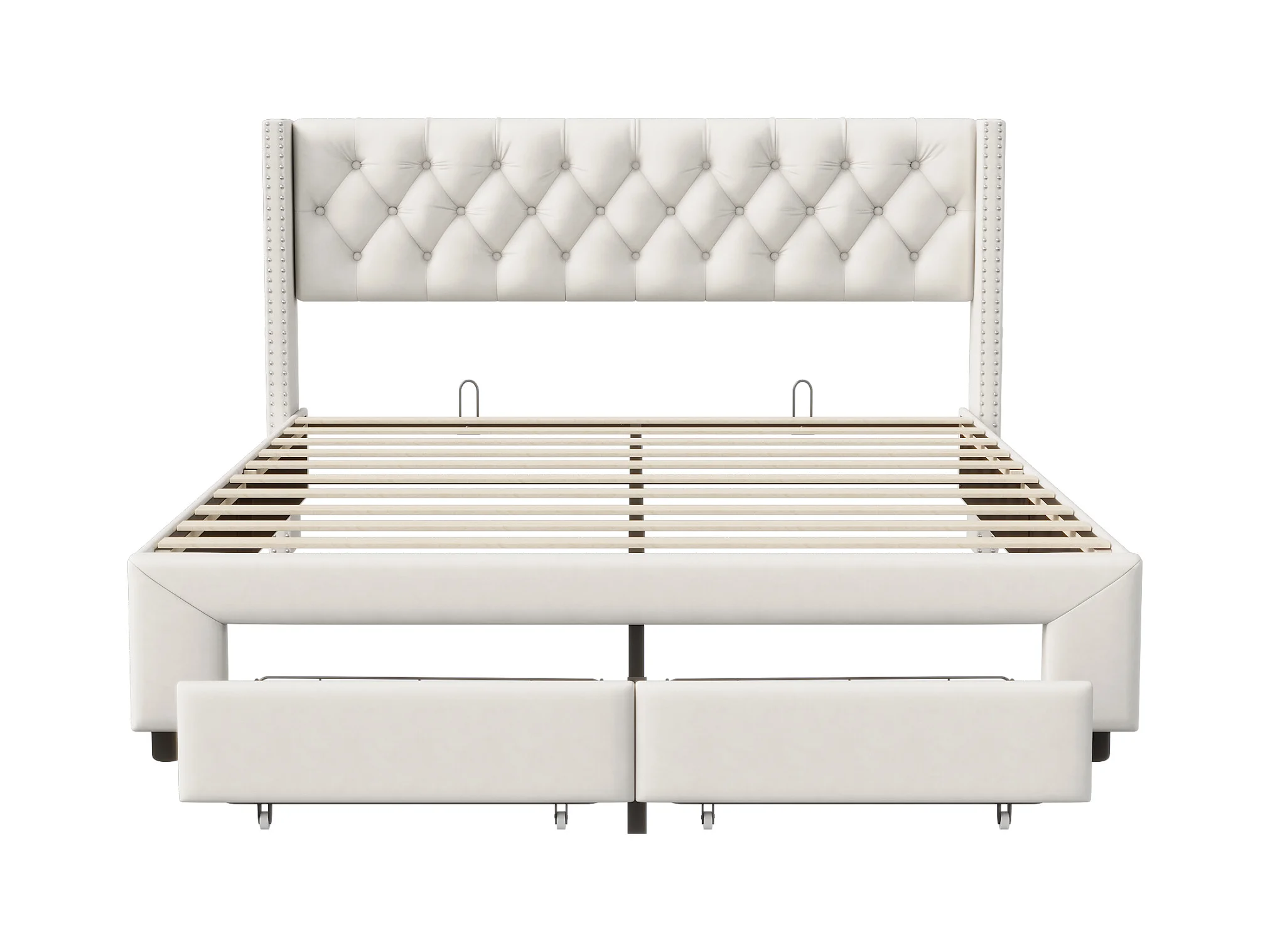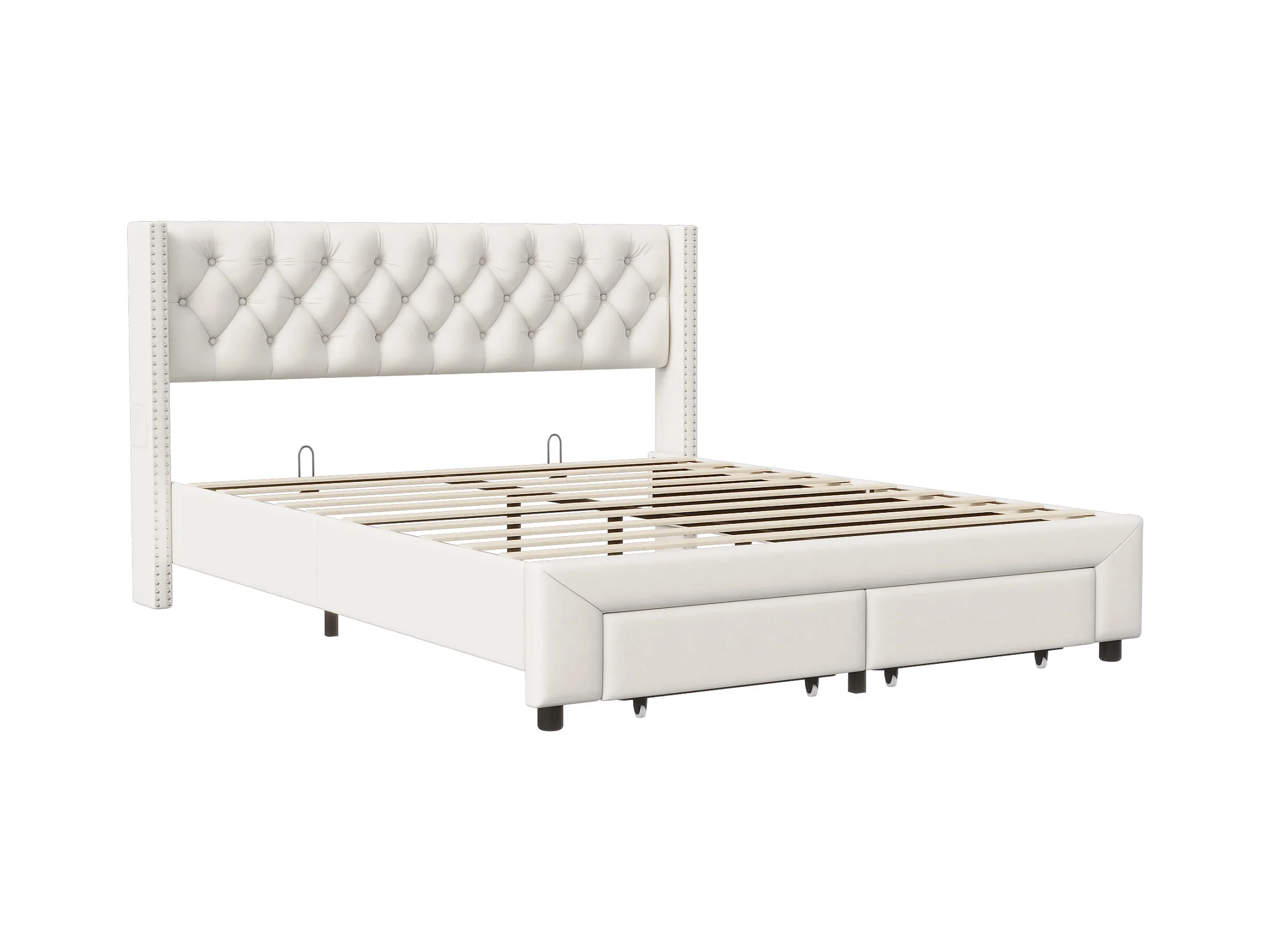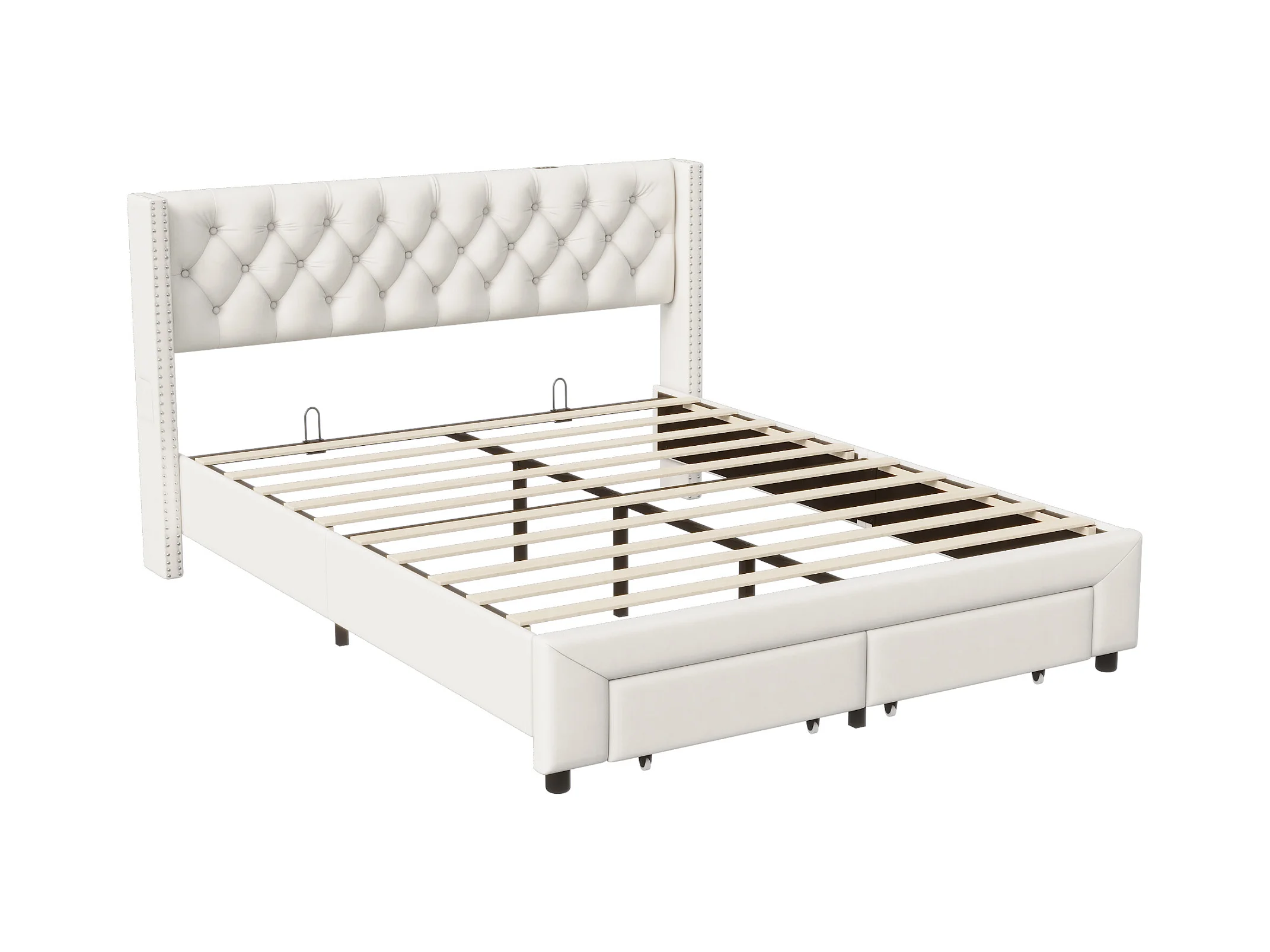 Lit à rivets 160*200cm, tiroir + bande lumineuse + port de chargement USB + sac de rangement, velours,beige