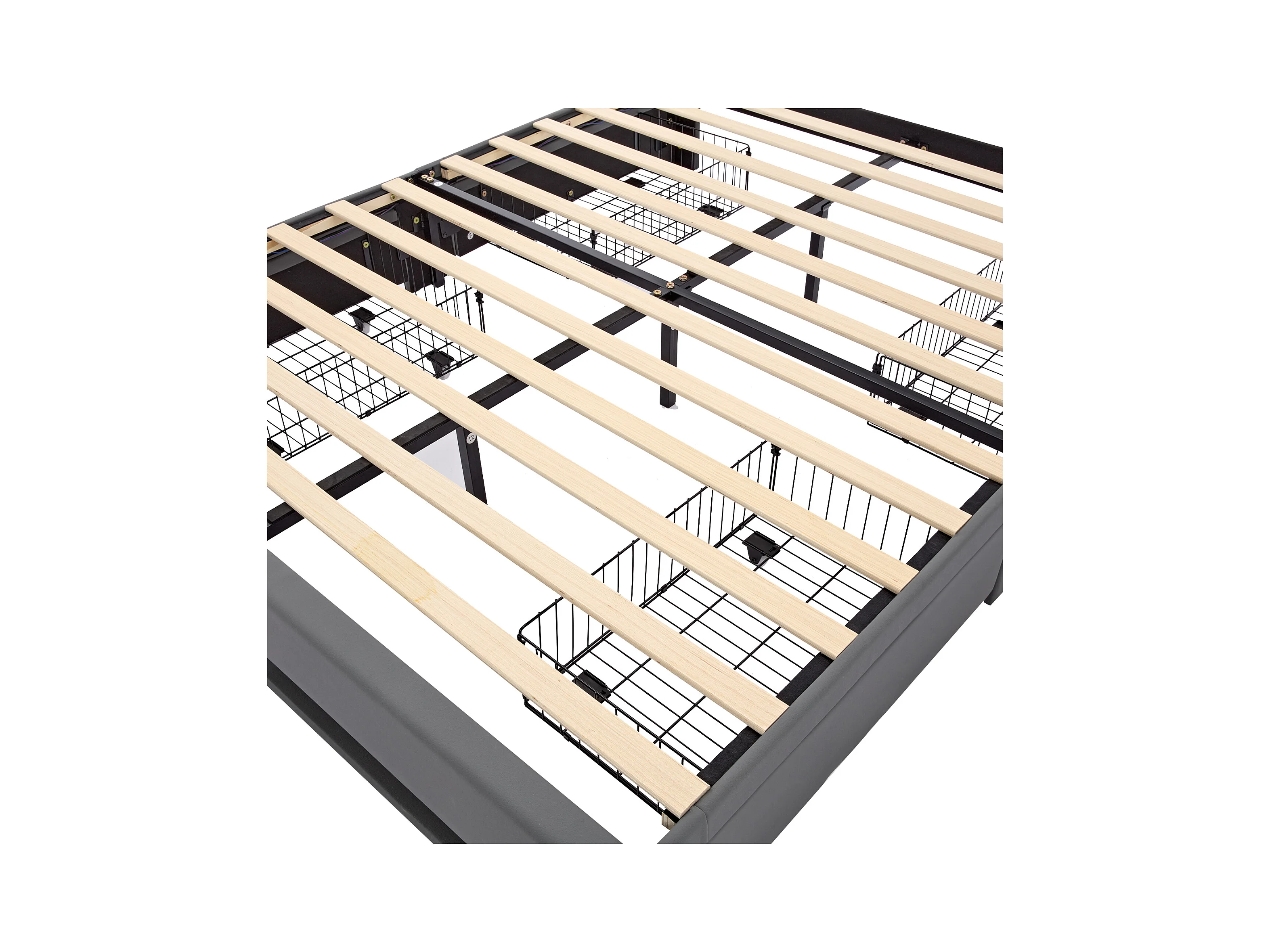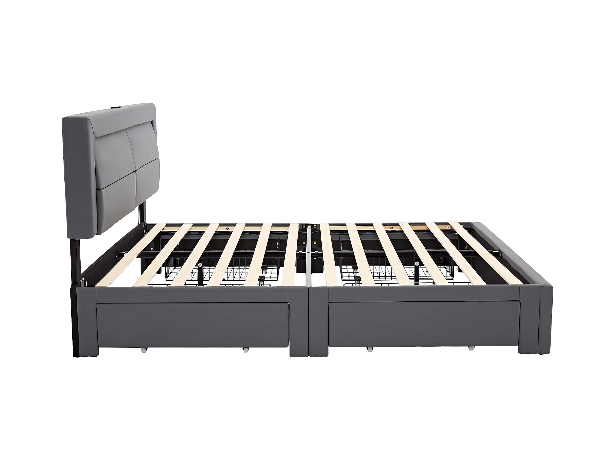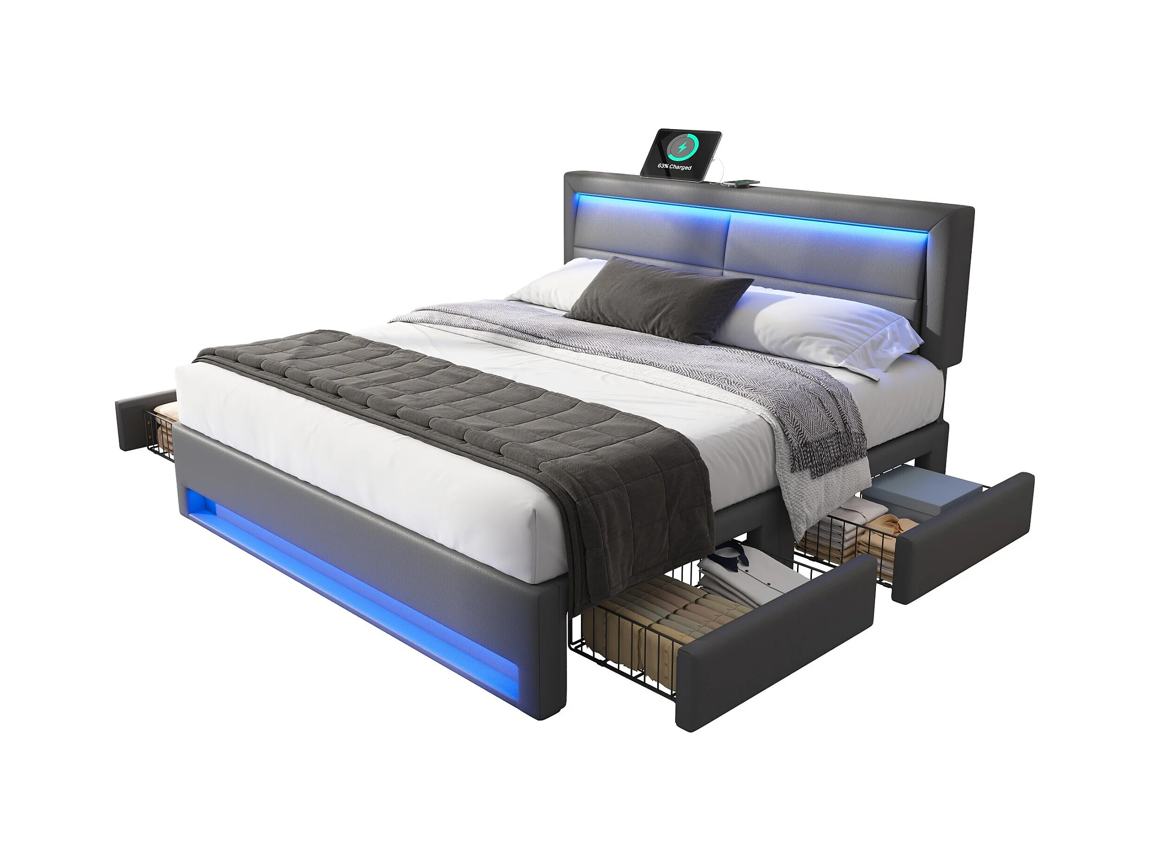 Lit adulte 140 x 200 cm - Lit double avec éclairage LED et quatre tiroirs - PU gris - sans matelas