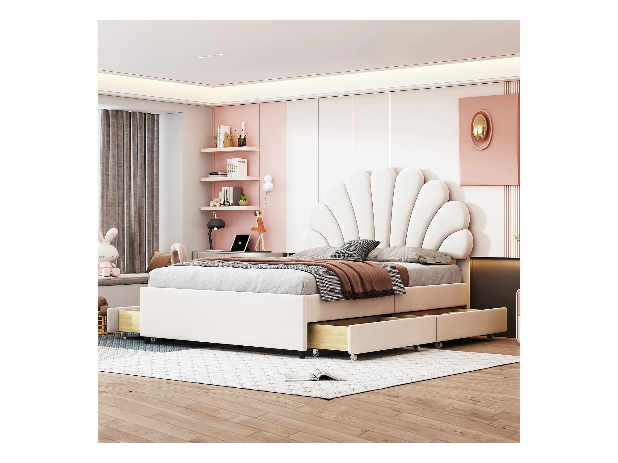 Lit adulte 140 x 200 cm - velours beige - avec tête de lit et sommier à lattes capitonnés - 4 tiroirs - sans matelas