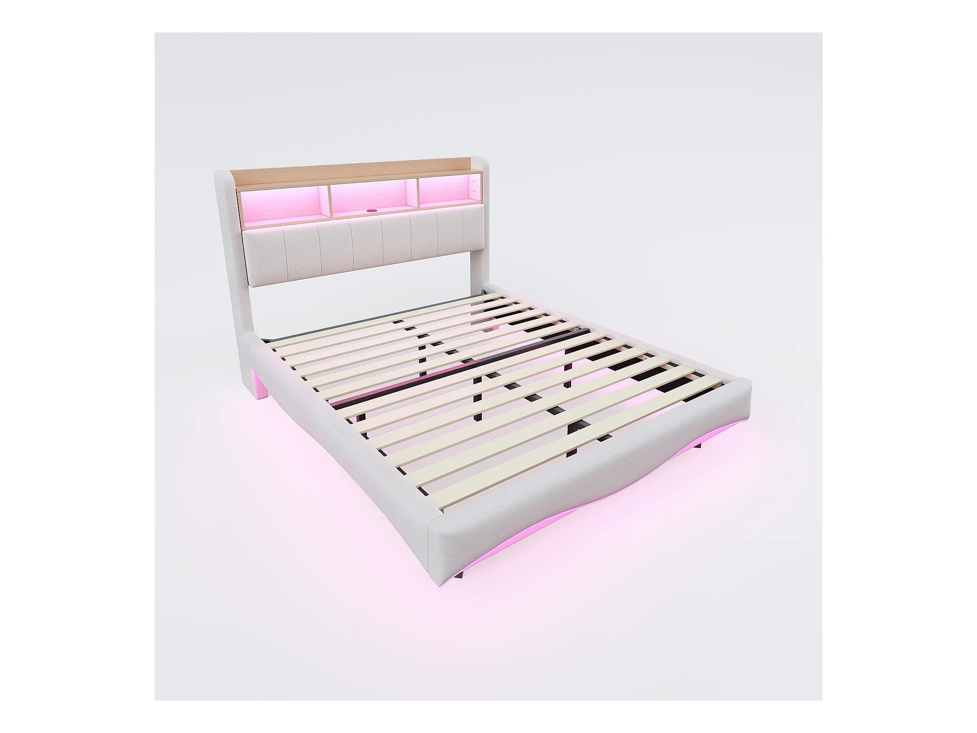 Lit adulte 140x200 cm, lin beige, lit double avec LED et ports USB/Type-C, tête de lit avec rangement