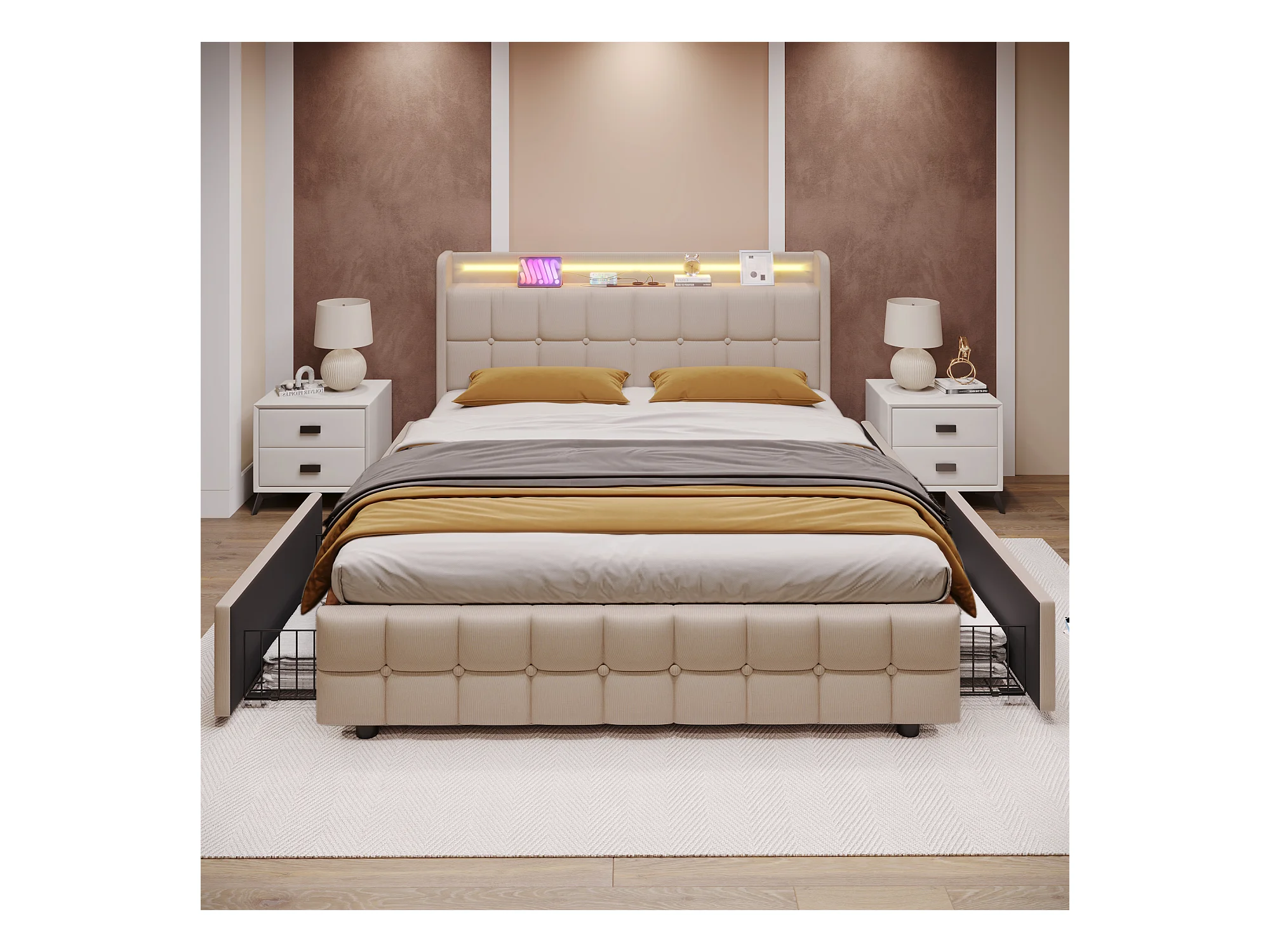 Lit adulte 160x200 cm beige avec 4 tiroirs, port USB et LED, lin, sommier à lattes, sans matelas