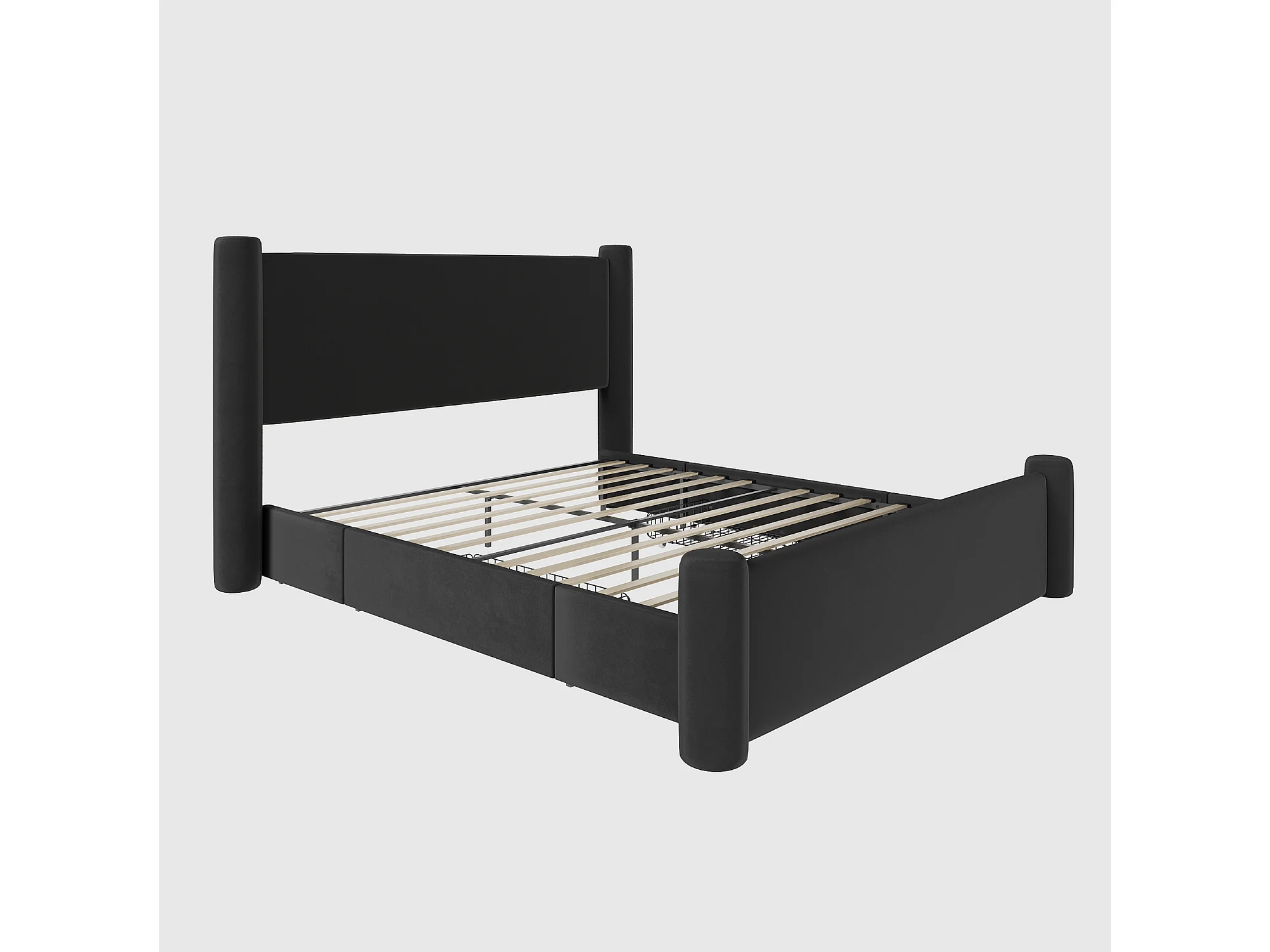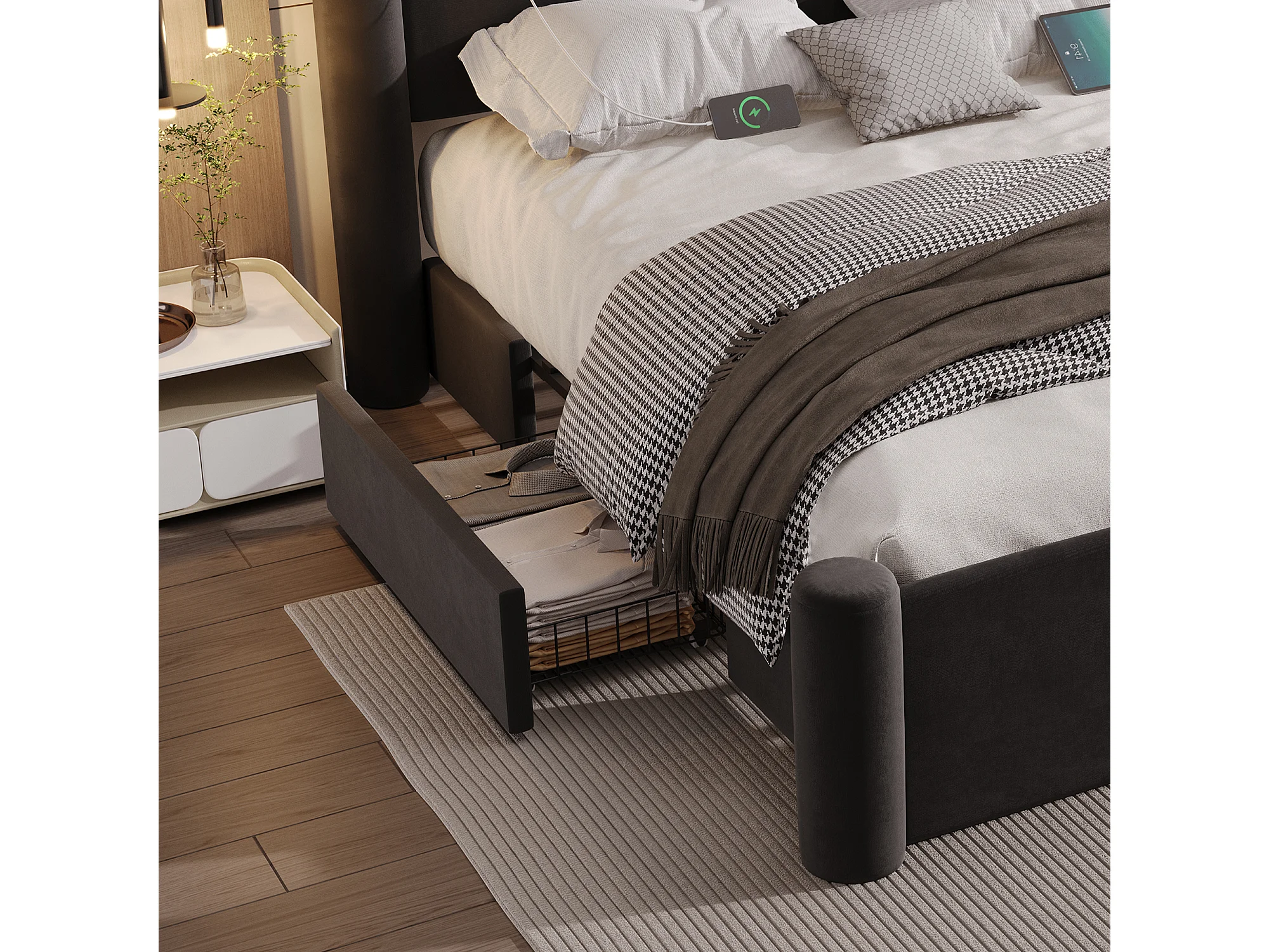 Lit adulte 160x200cm avec 2 tiroirs et USB type-C, velours noir, sans matelas