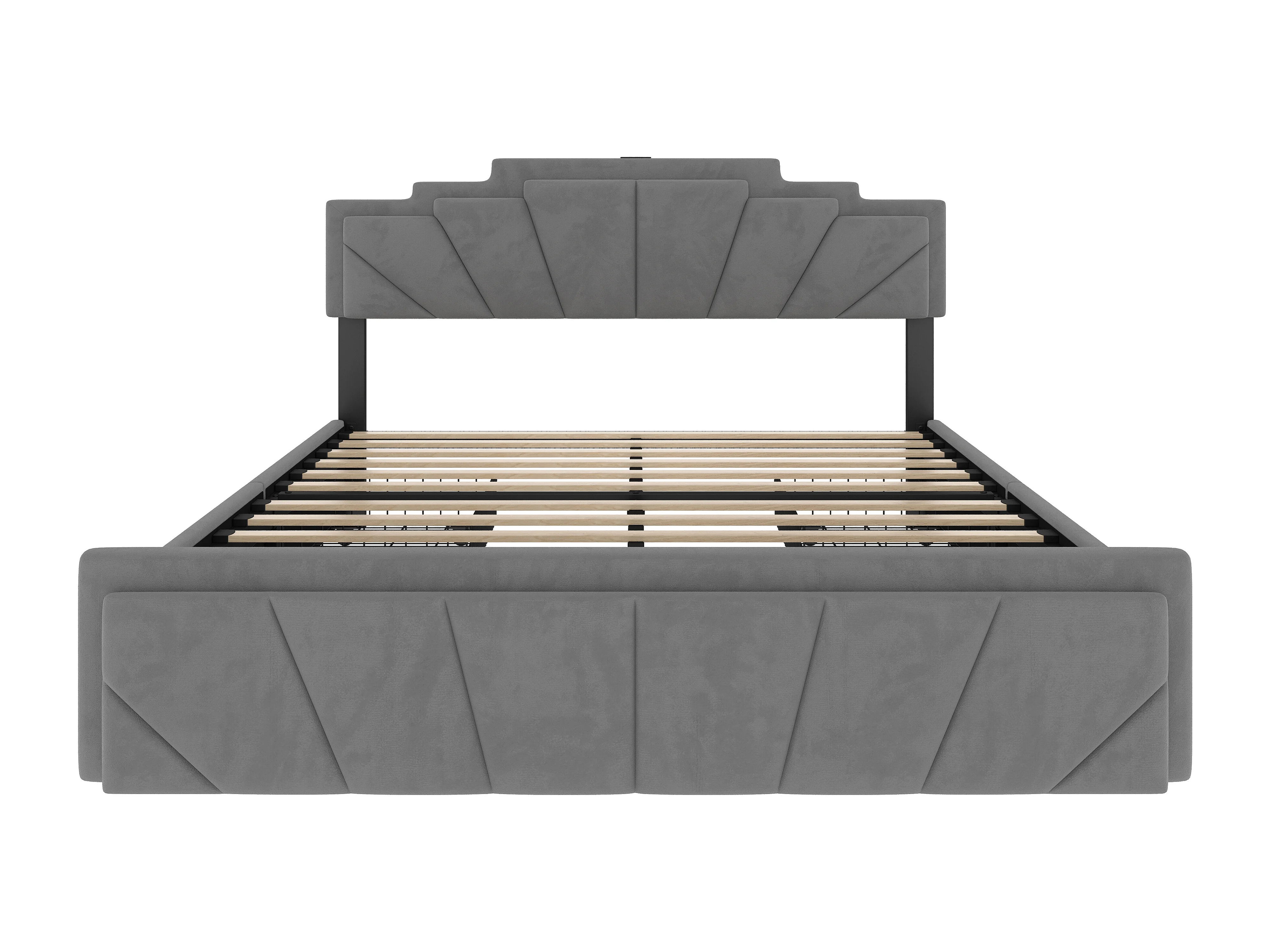 Lit adulte 160x200cm avec 4 tiroirs, LED et USB type-C, tête de lit réglable, velours gris, sans matelas