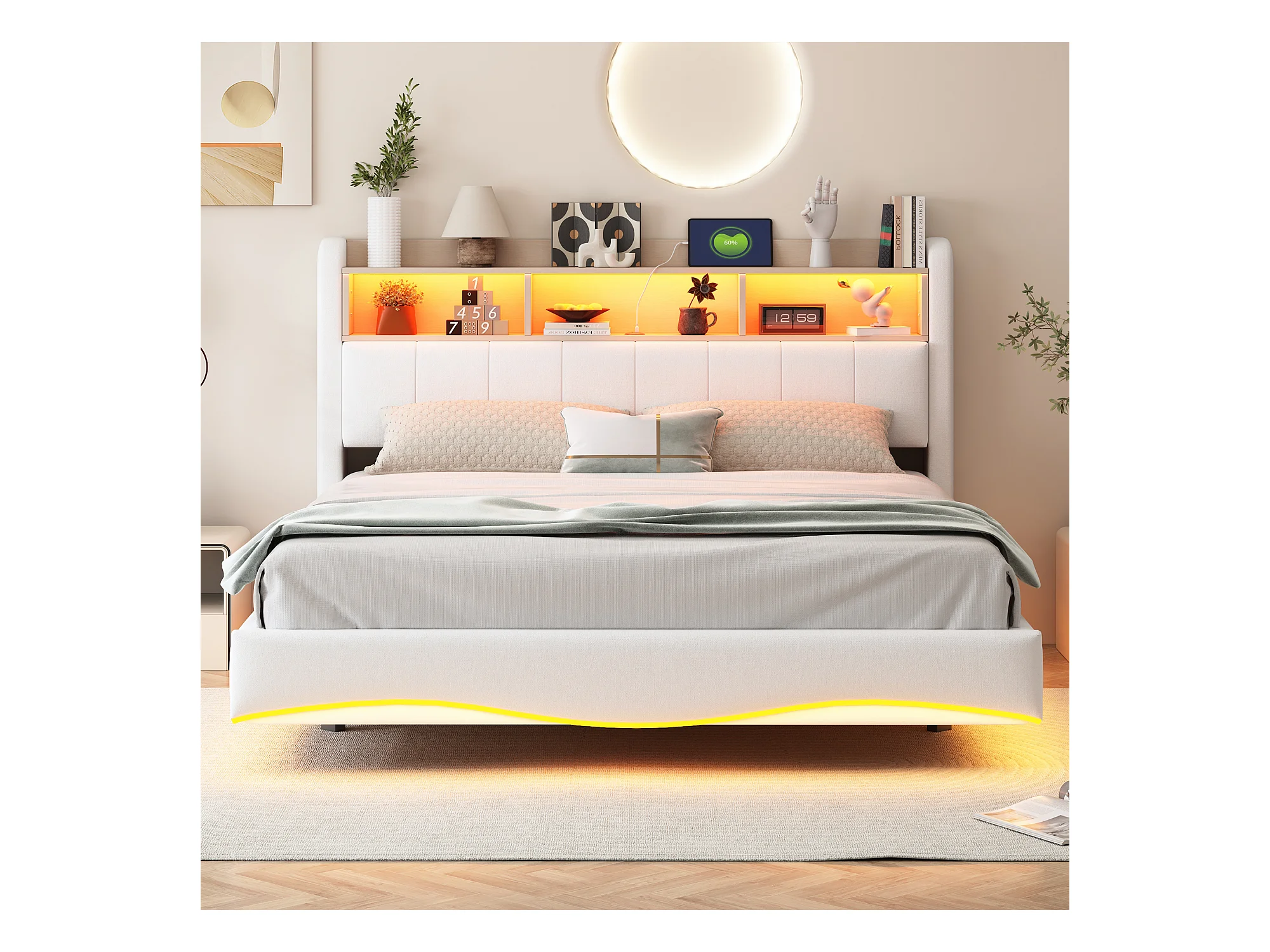 Lit adulte 160x200cm beige en lin avec LED et USB, designe flottant, sommier à lattes, sans matelas
