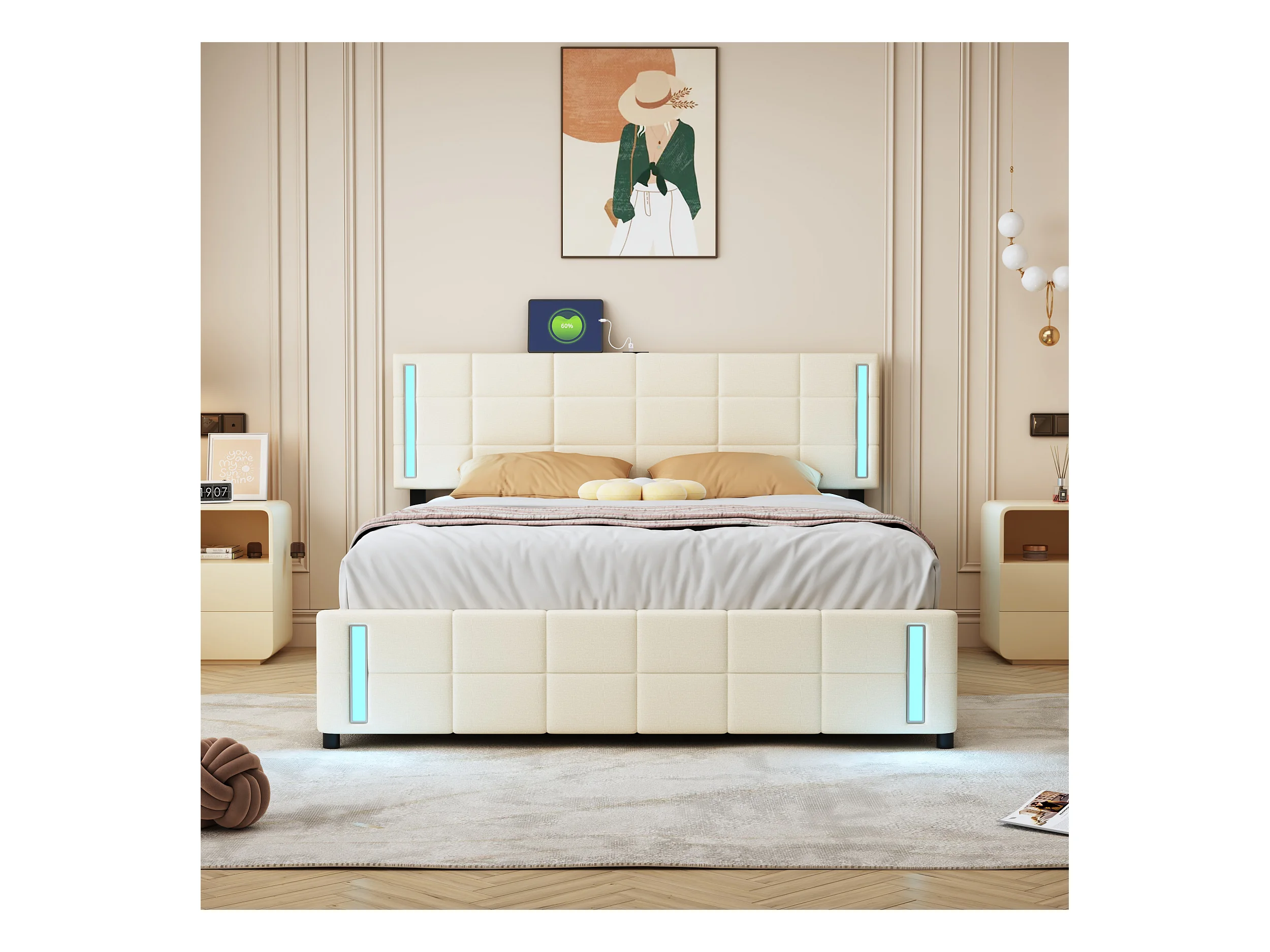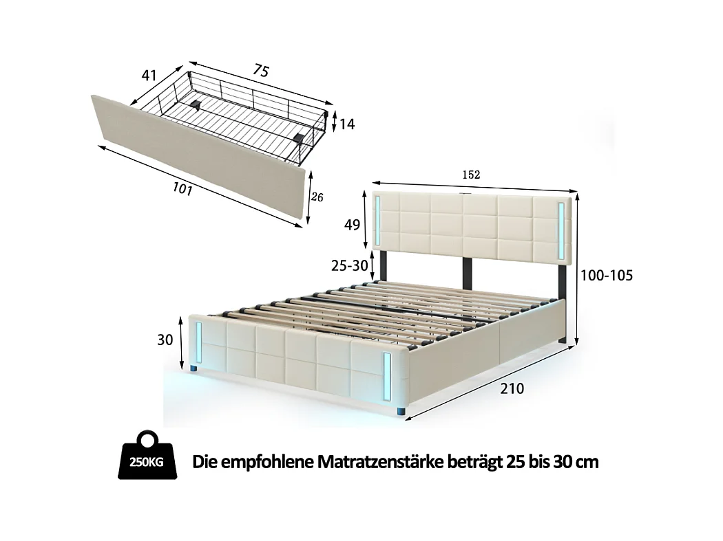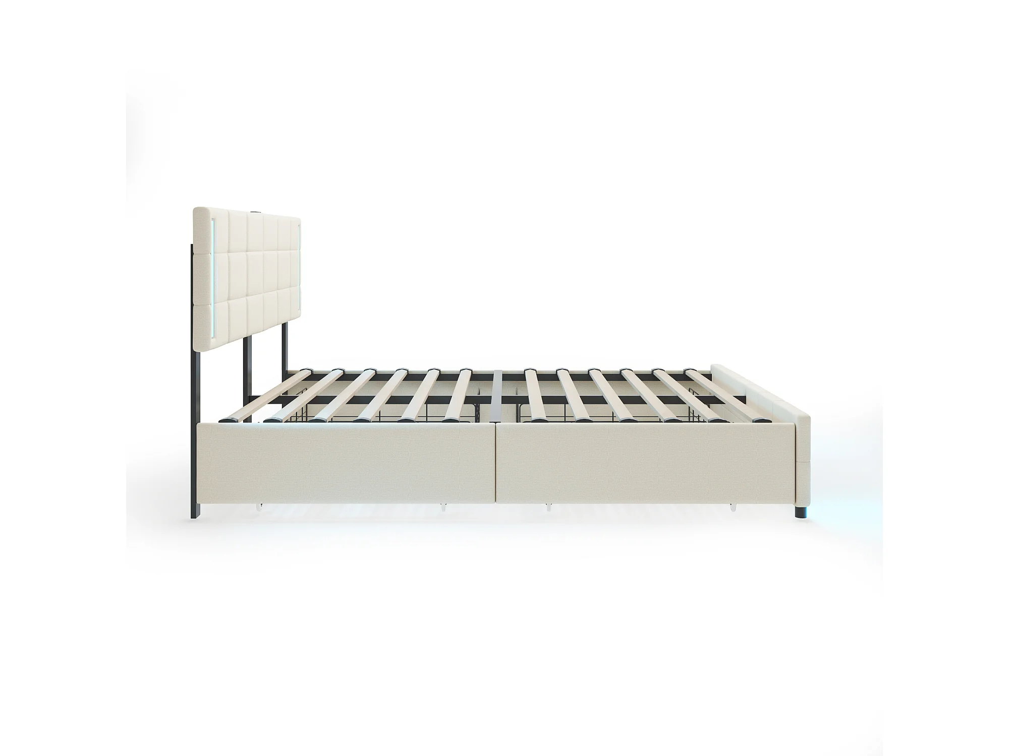 Lit adulte 160x200cm blanc en PU avec 4 tiroirs, LED et USB, cadre en métal, sans matelas