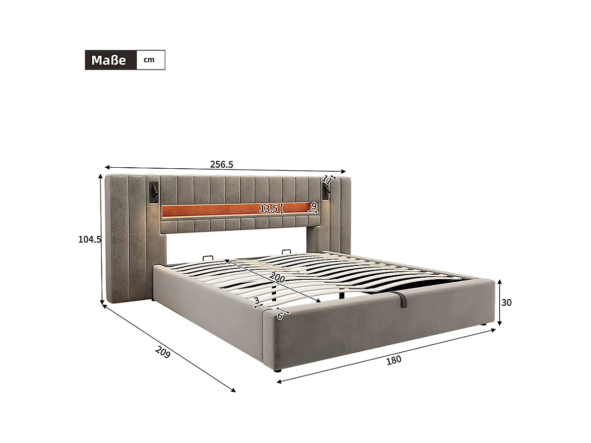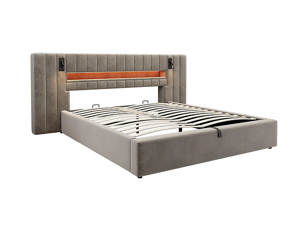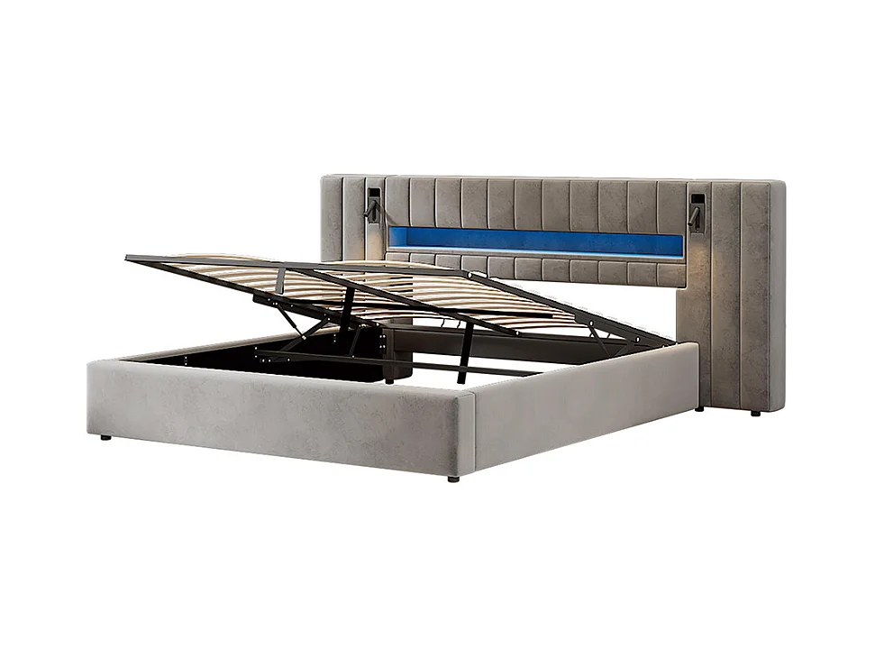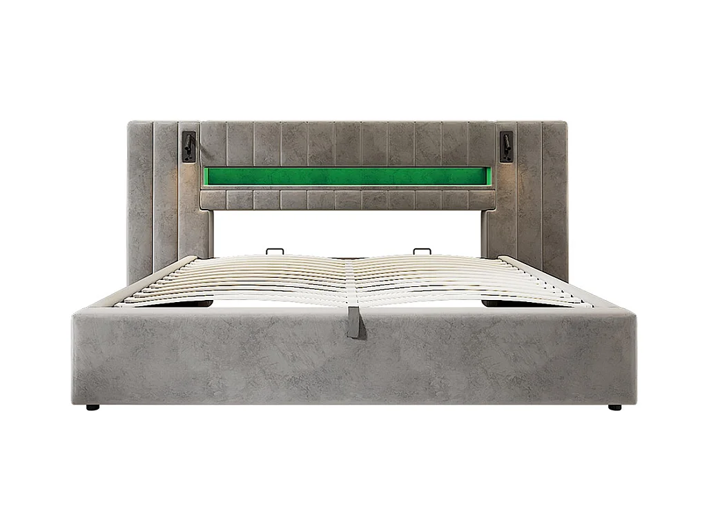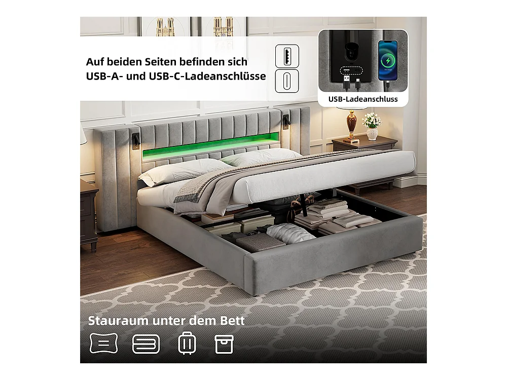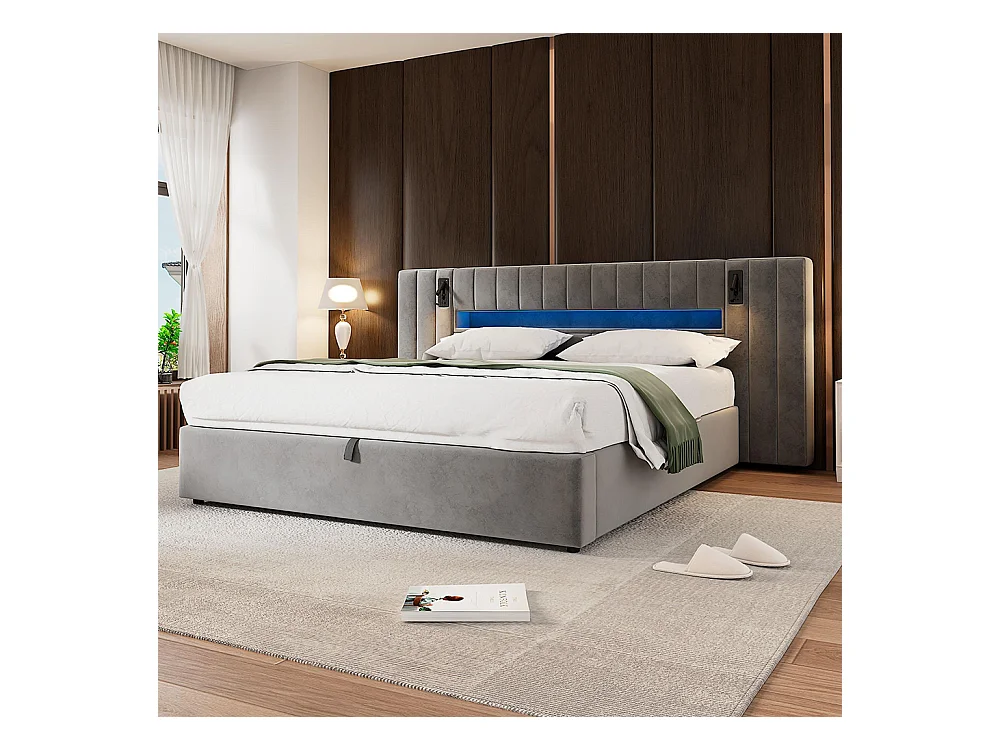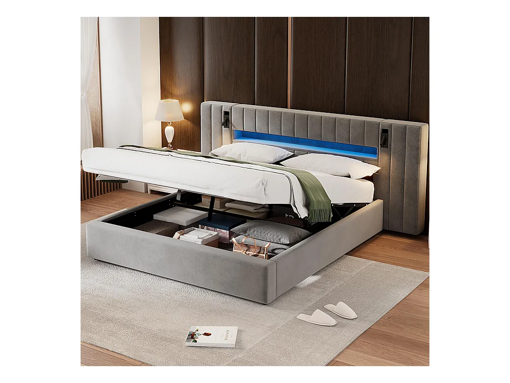 Lit adulte 180 x 200 cm, avec port USB, avec éclairage LED, lampe de chevet, espace de rangement, velours, gris
