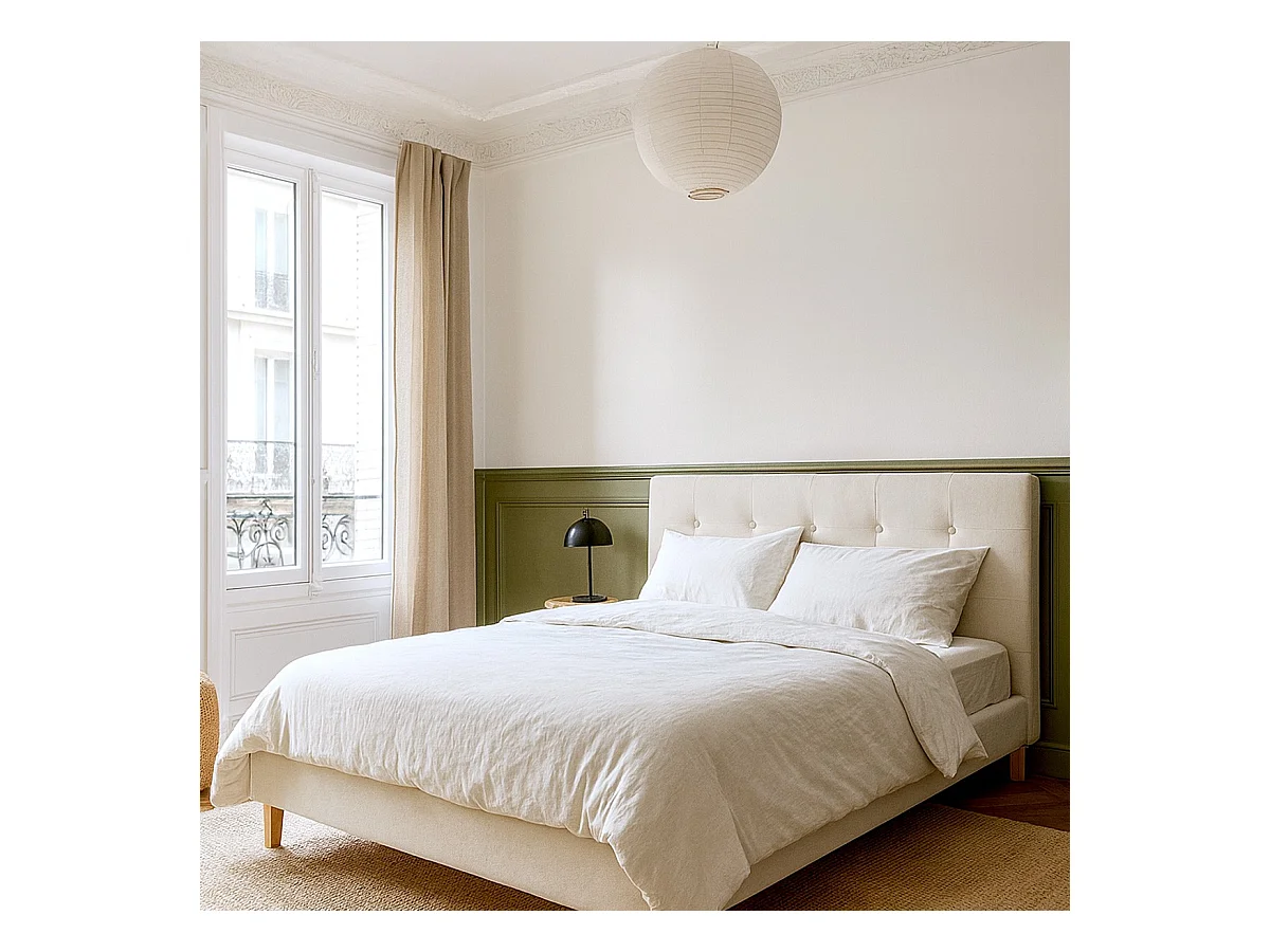 Lit adulte 180x200 cm avec tête de lit capitonnée en velours beige - Milo