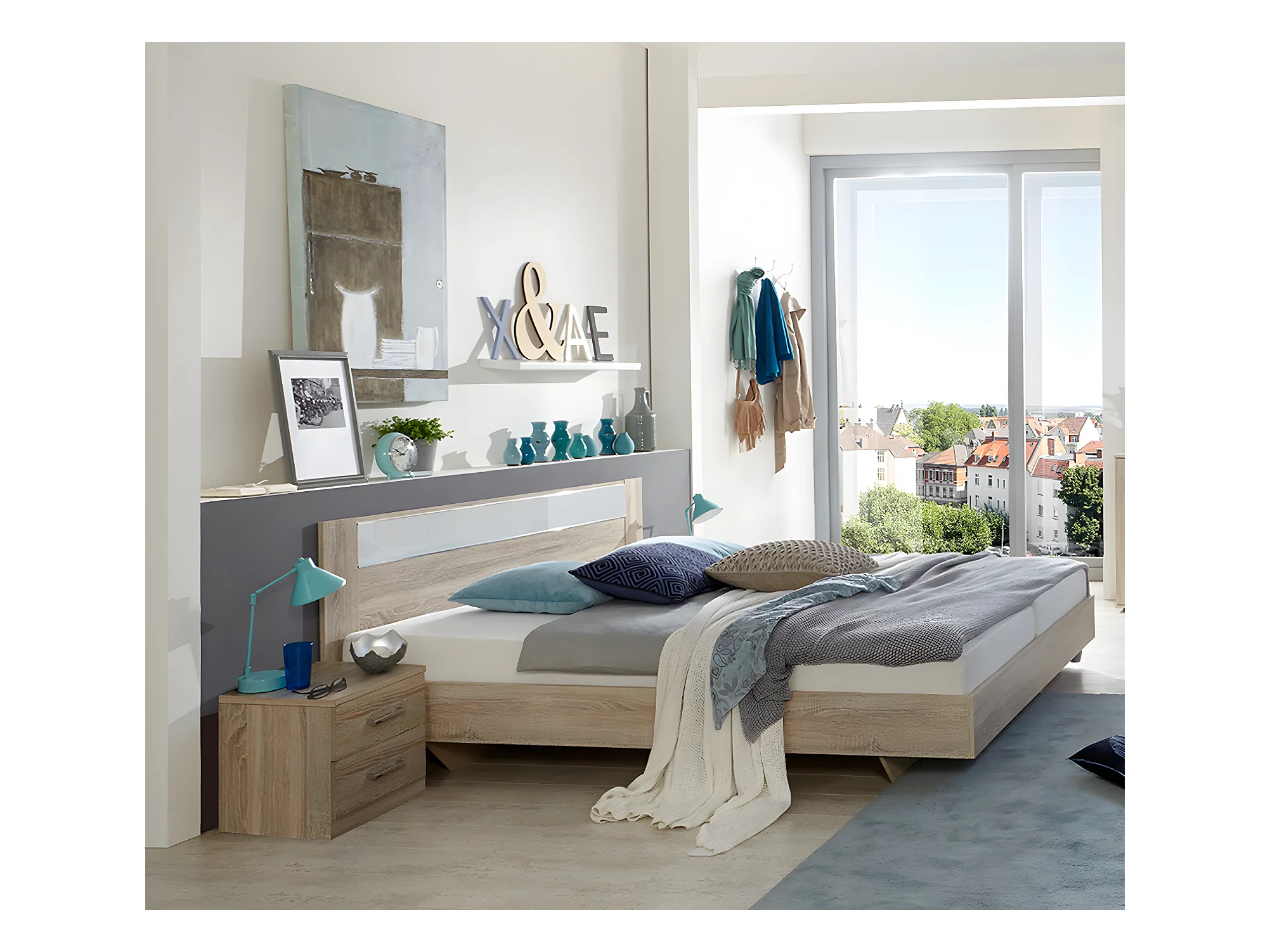 Lit adulte avec 2 chevets imitation chêne, rechampis verre blanc + chrome - Dim: 160 x 200 cm