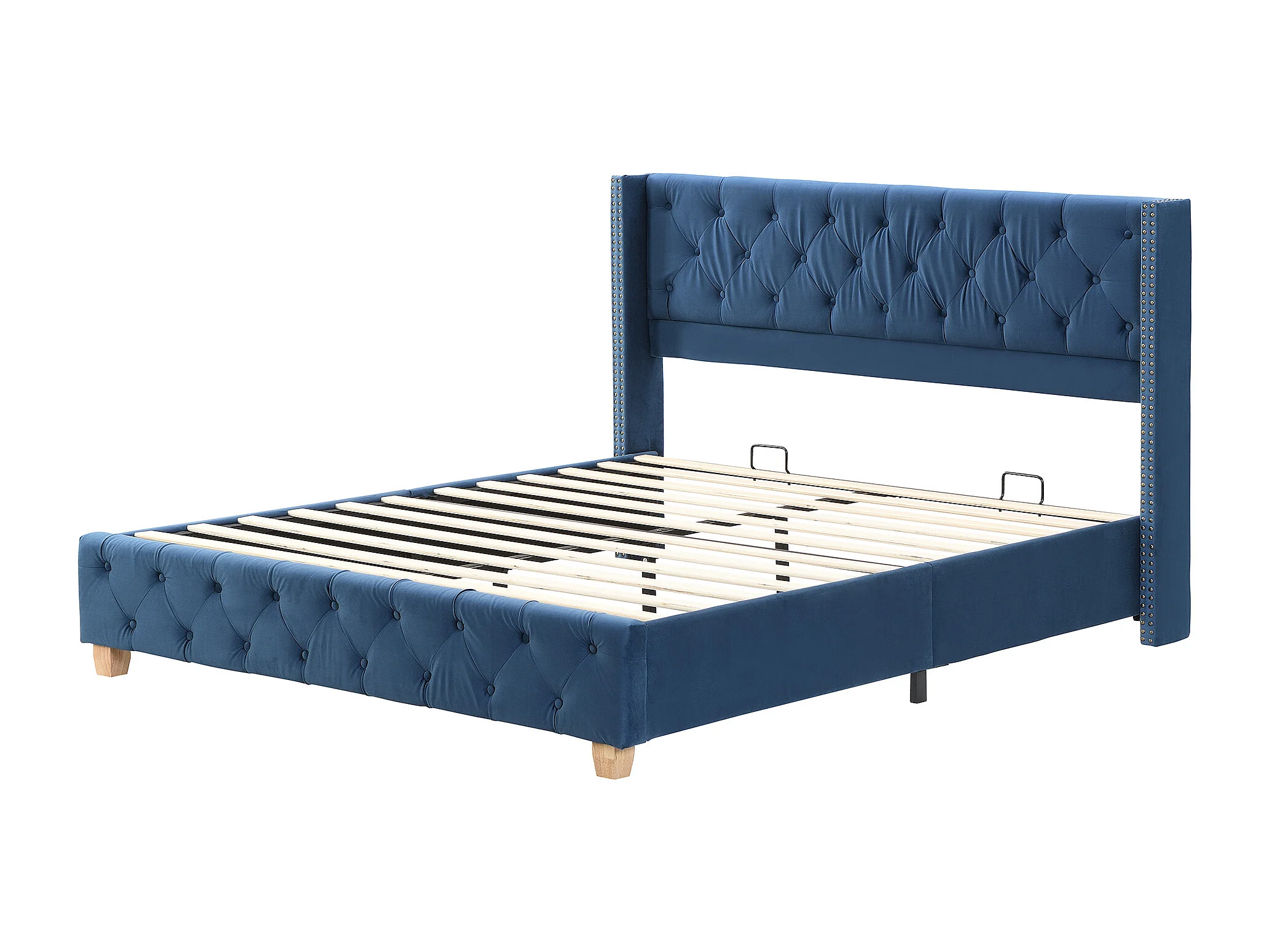 Lit adulte 160x200 cm avec sommier - tête de lit capitonnée - cadre de lit en bois - velours bleu (sans matelas)