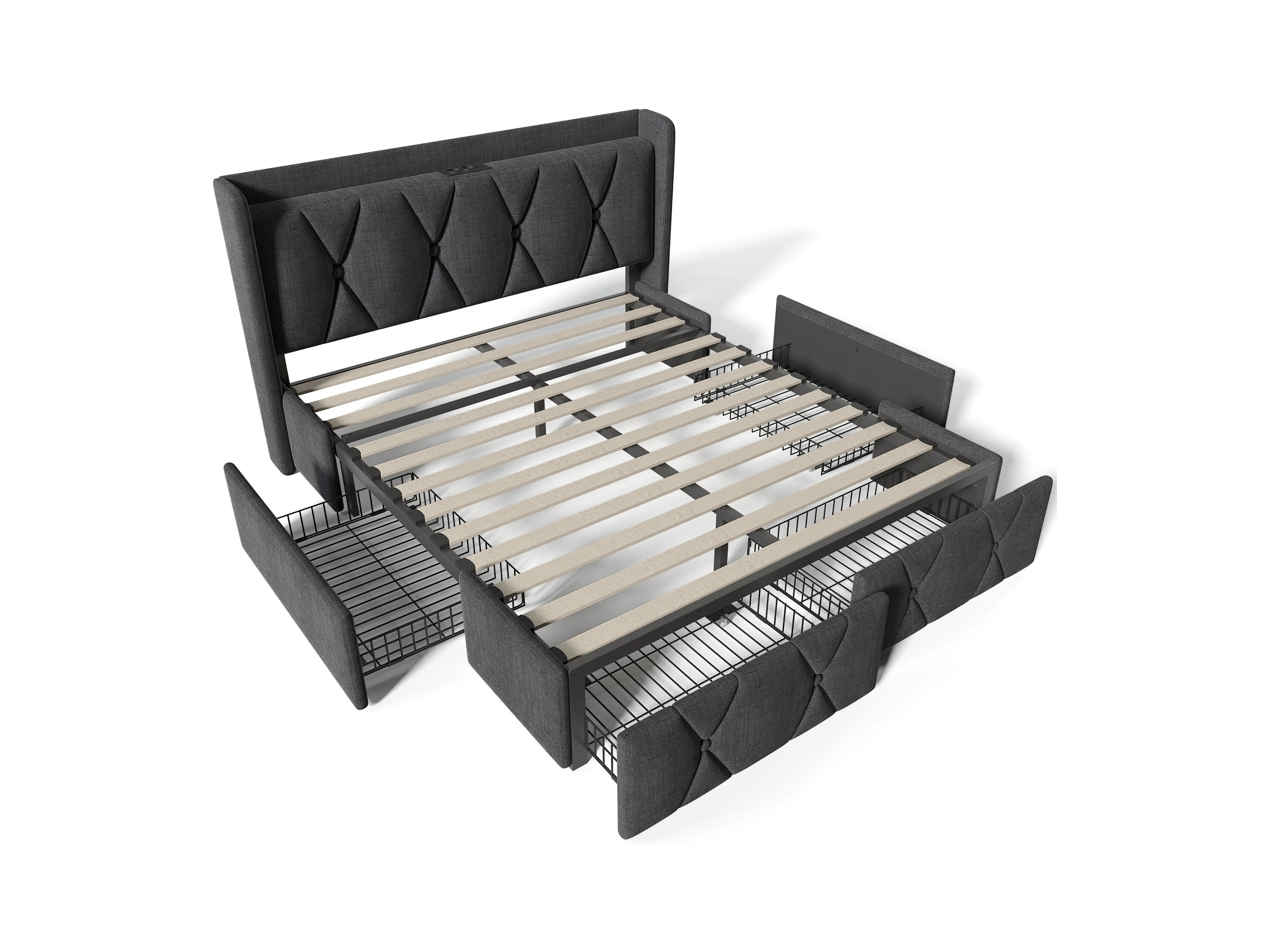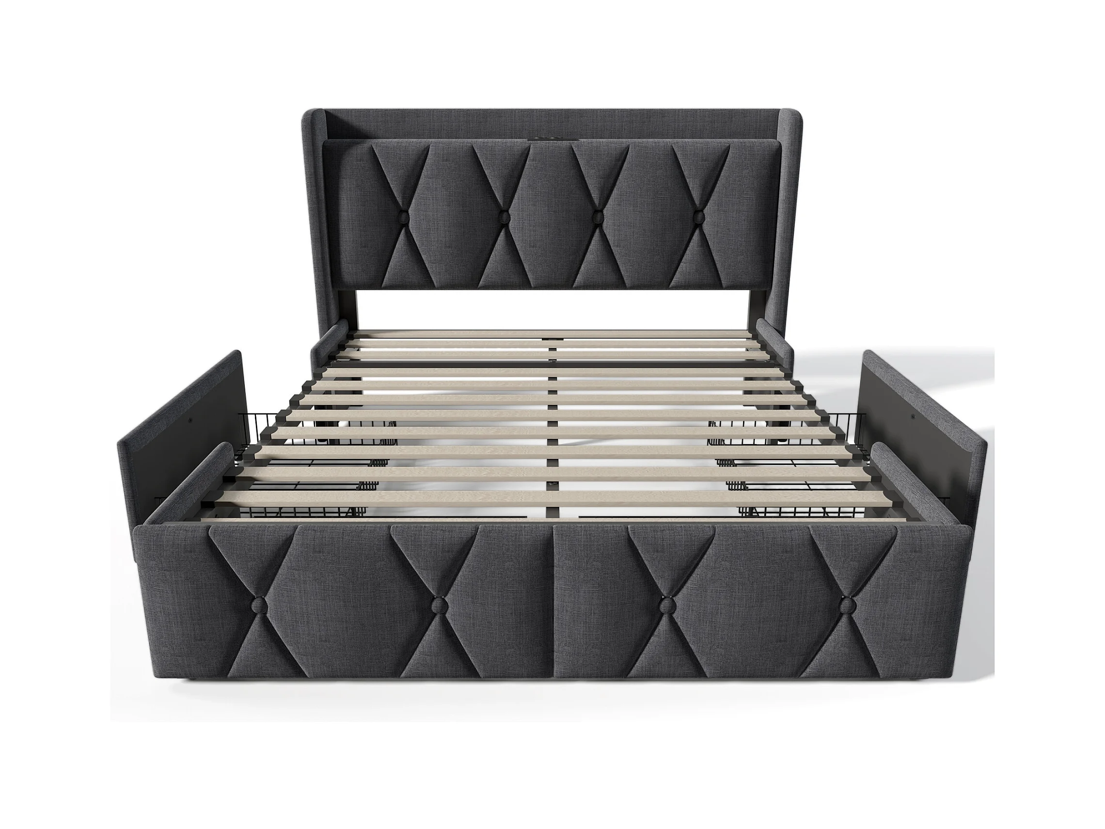 Lit adulte 160x200 cm avec sommier - tête de lit USB et 4 tiroirs de rangement - tissu lin gris (sans matelas)