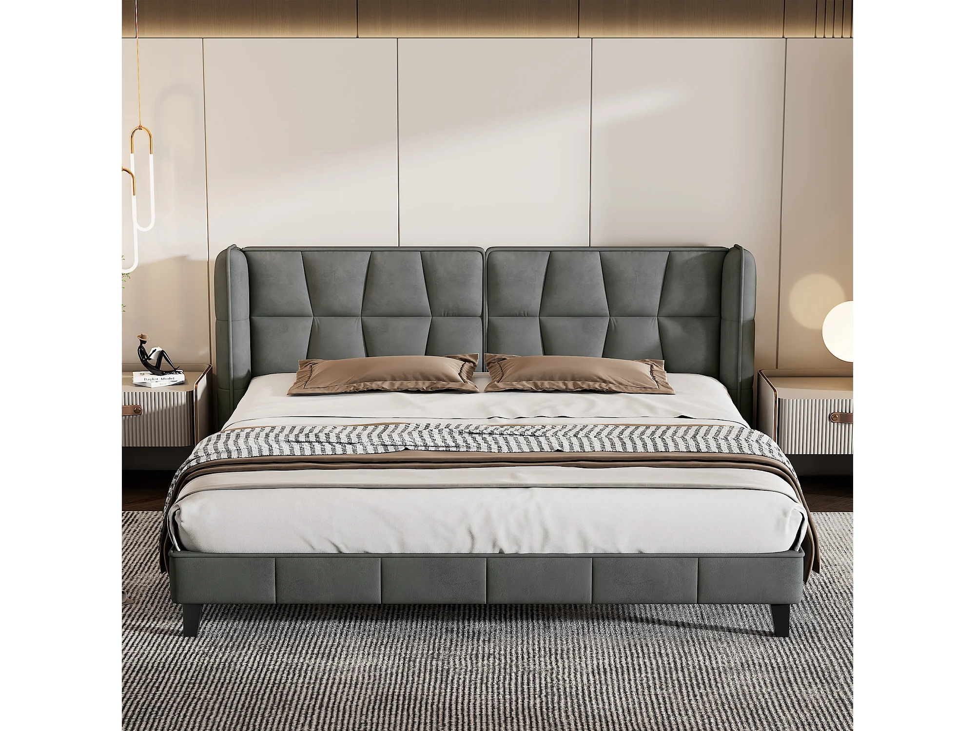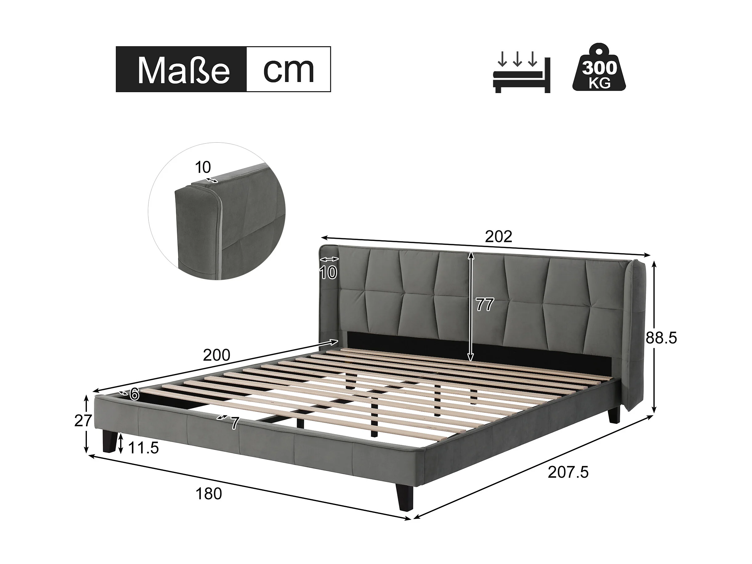 Lit adulte 180x200 cm avec sommier - tête de lit rembourré - bois - velours gris (sans matelas)