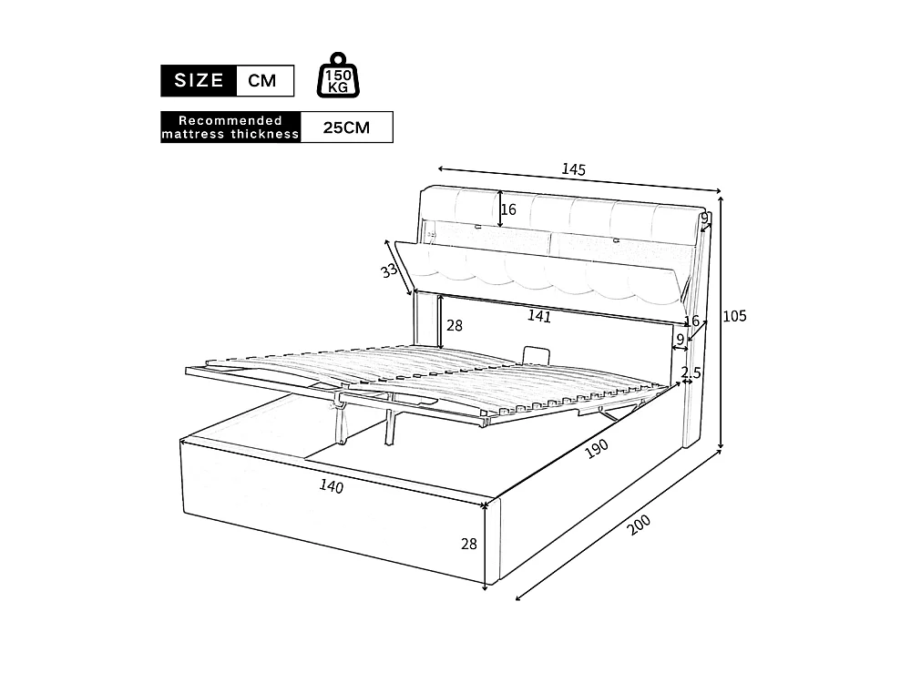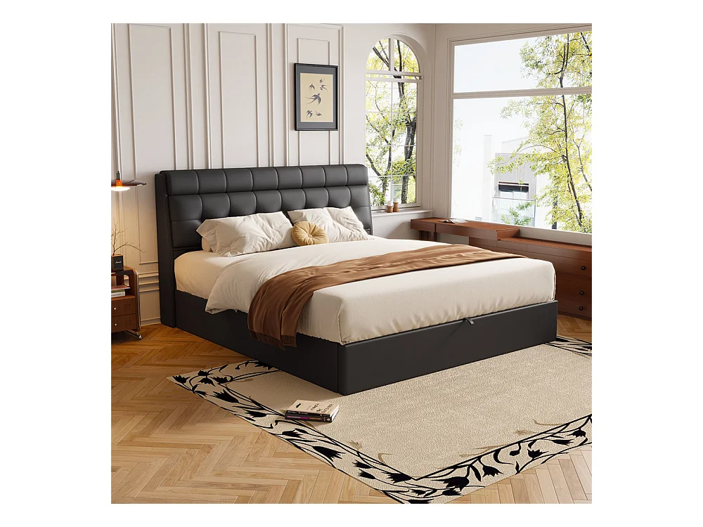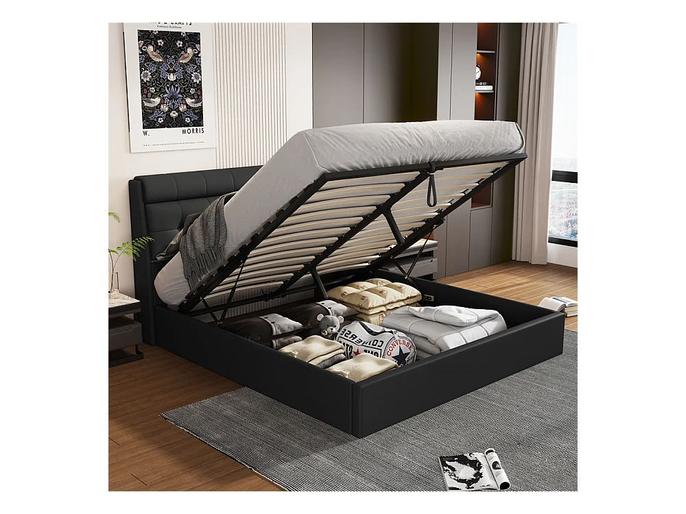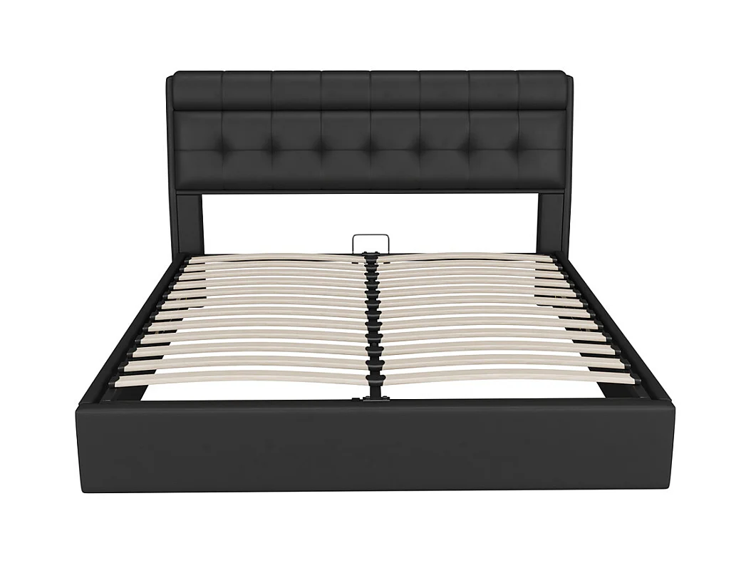 Lit adulte lit 140x190 cm lit rembourré hydraulique lit double avec sommier à lattes pu noir