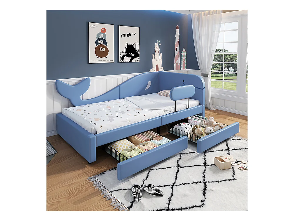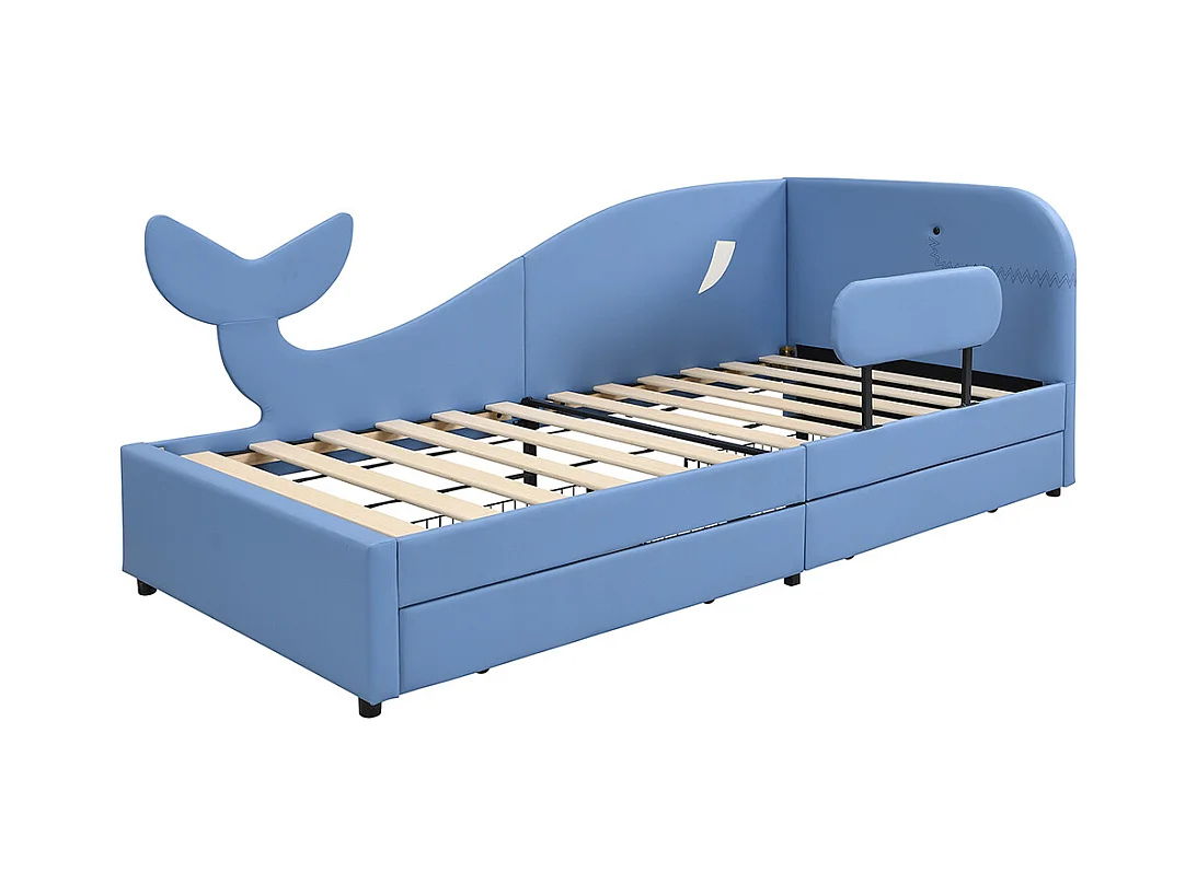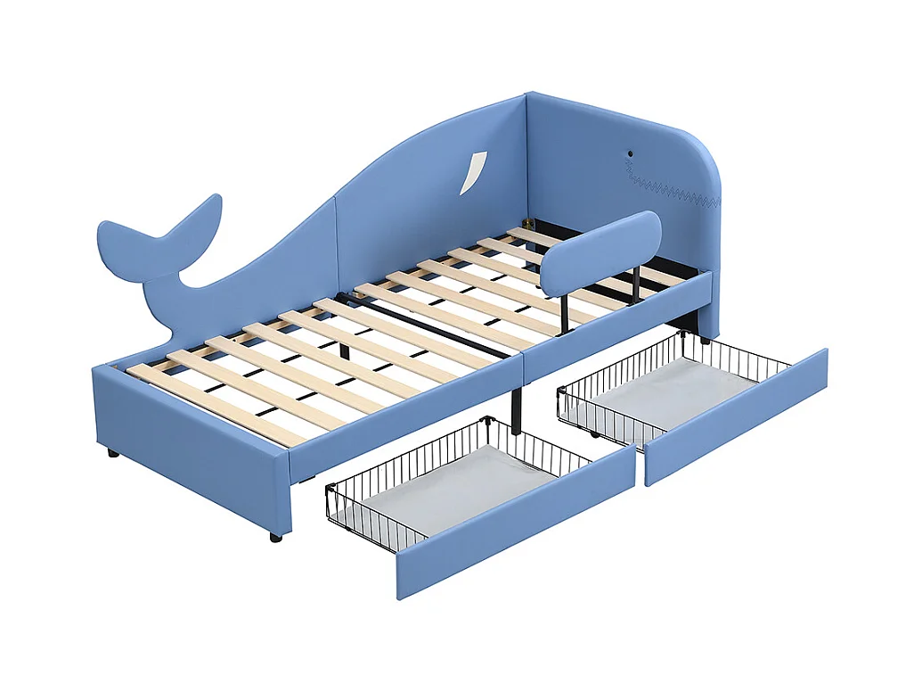 Lit avec 2 tiroirs 90x200 pour enfant design baleine avec sommier en métal sur roulettes structure MDF bleu
