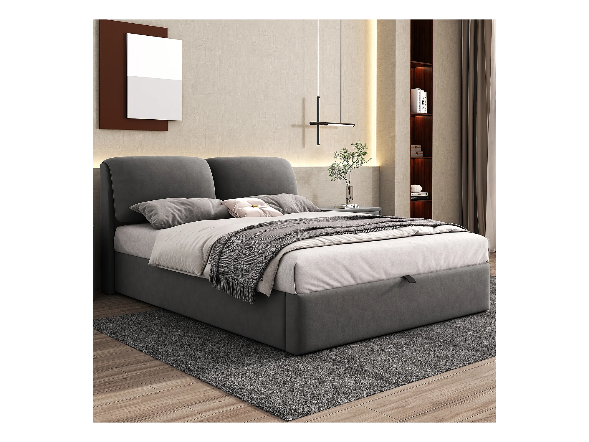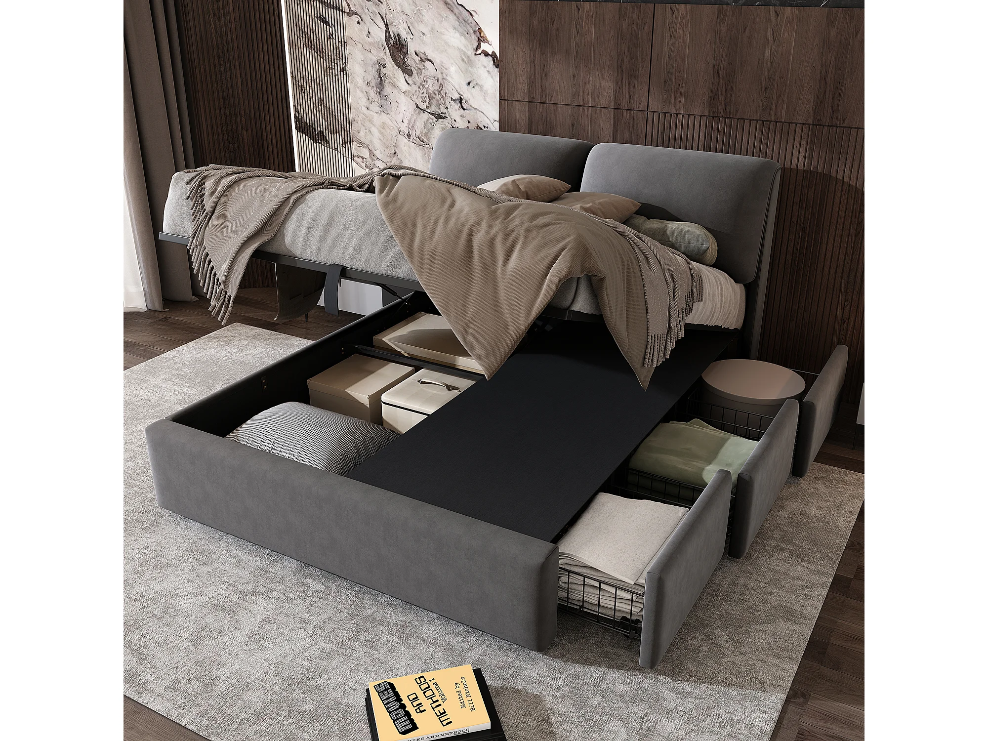 Lit avec coffre de rangement hydraulique, 140x200 cm, trois tiroirs, tissu en velours, gris (longueur 198x largeur 31x hauteur 15 cm)