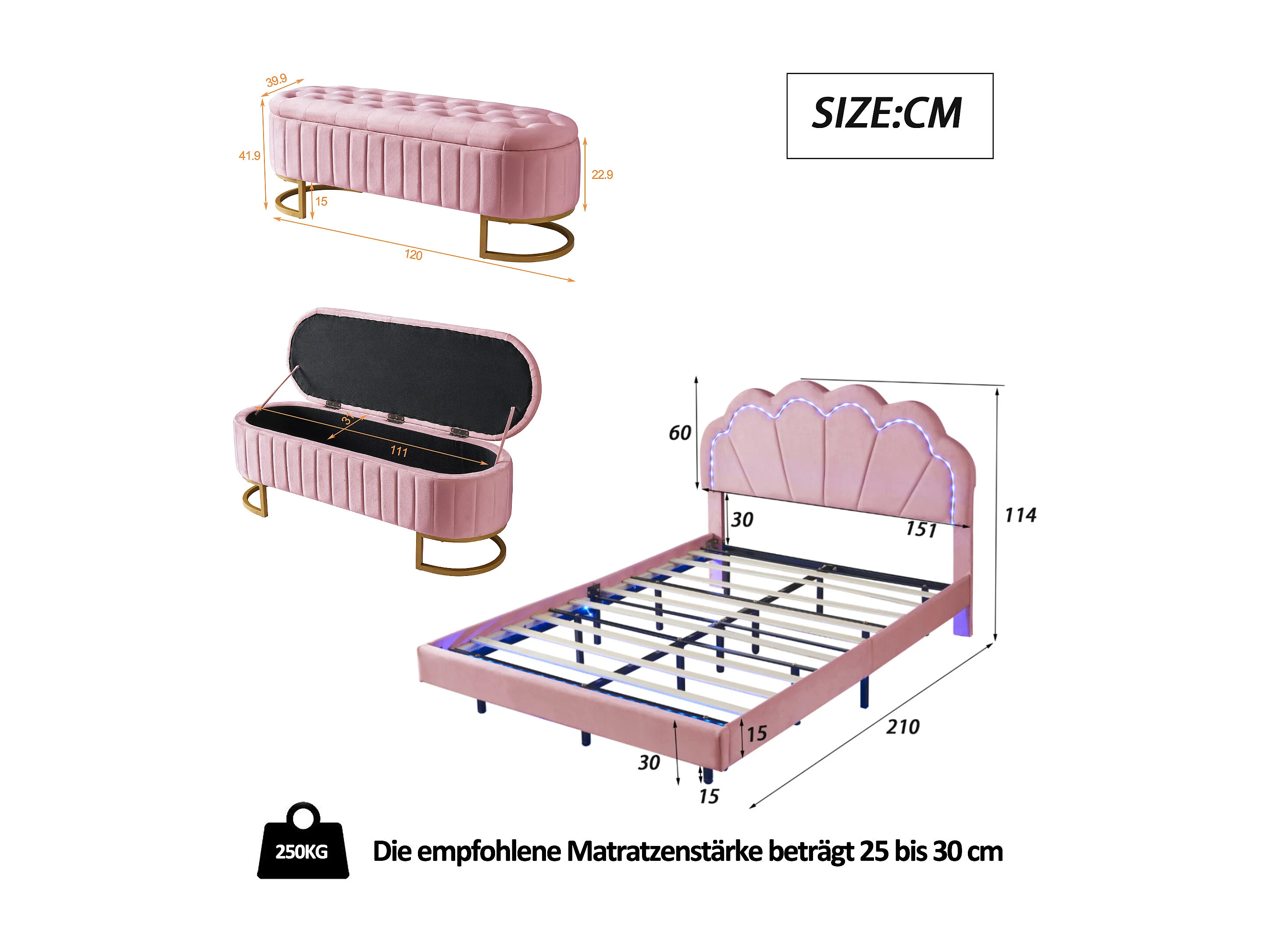 Lit avec LED 140x200 cm, cadre flottant avec stockage, tête de lit design unique, en velours rose (210x151x114 cm)