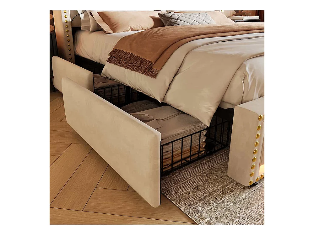 Lit avec rangement 140x200 lit double pour adolescent avec 4 tiroirs lumière LED et port de charge USB-C avec matelas en velours beige