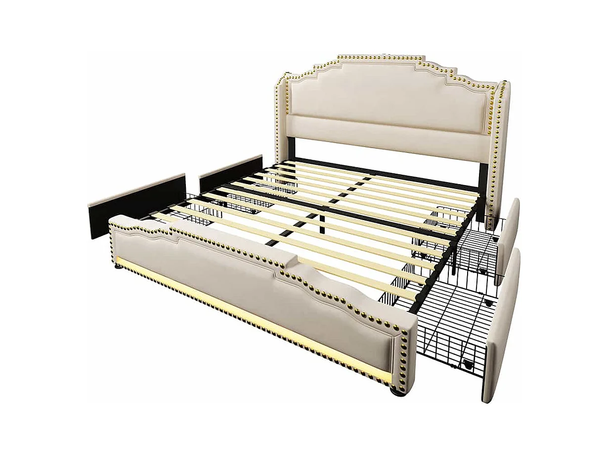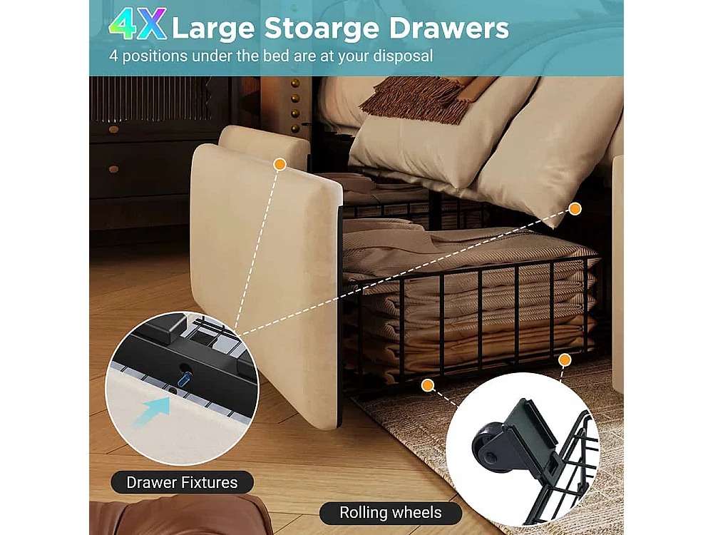 Lit avec rangement 140x200 lit double pour adolescent avec 4 tiroirs lumière LED et port de charge USB-C sanc matelas en velours beige
