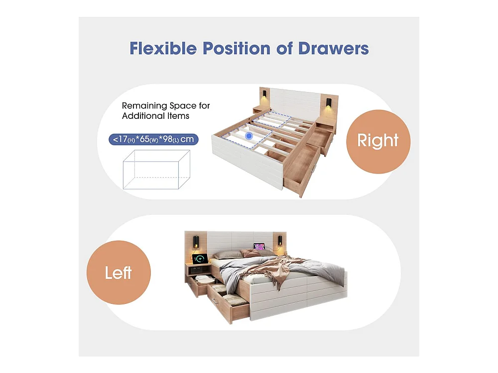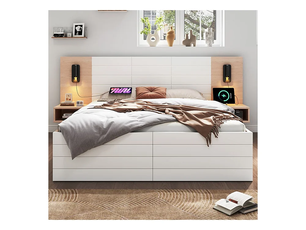 Lit avec rangement 160 x 200 cm avec 2 tiroirs tête de lit avec lumière de lecture et chargement USB incluant 2 chevets Avec matelas Blanc