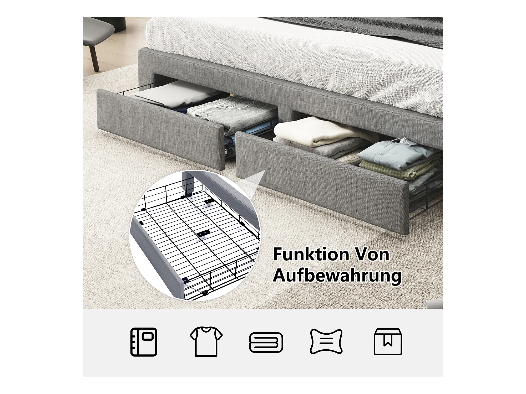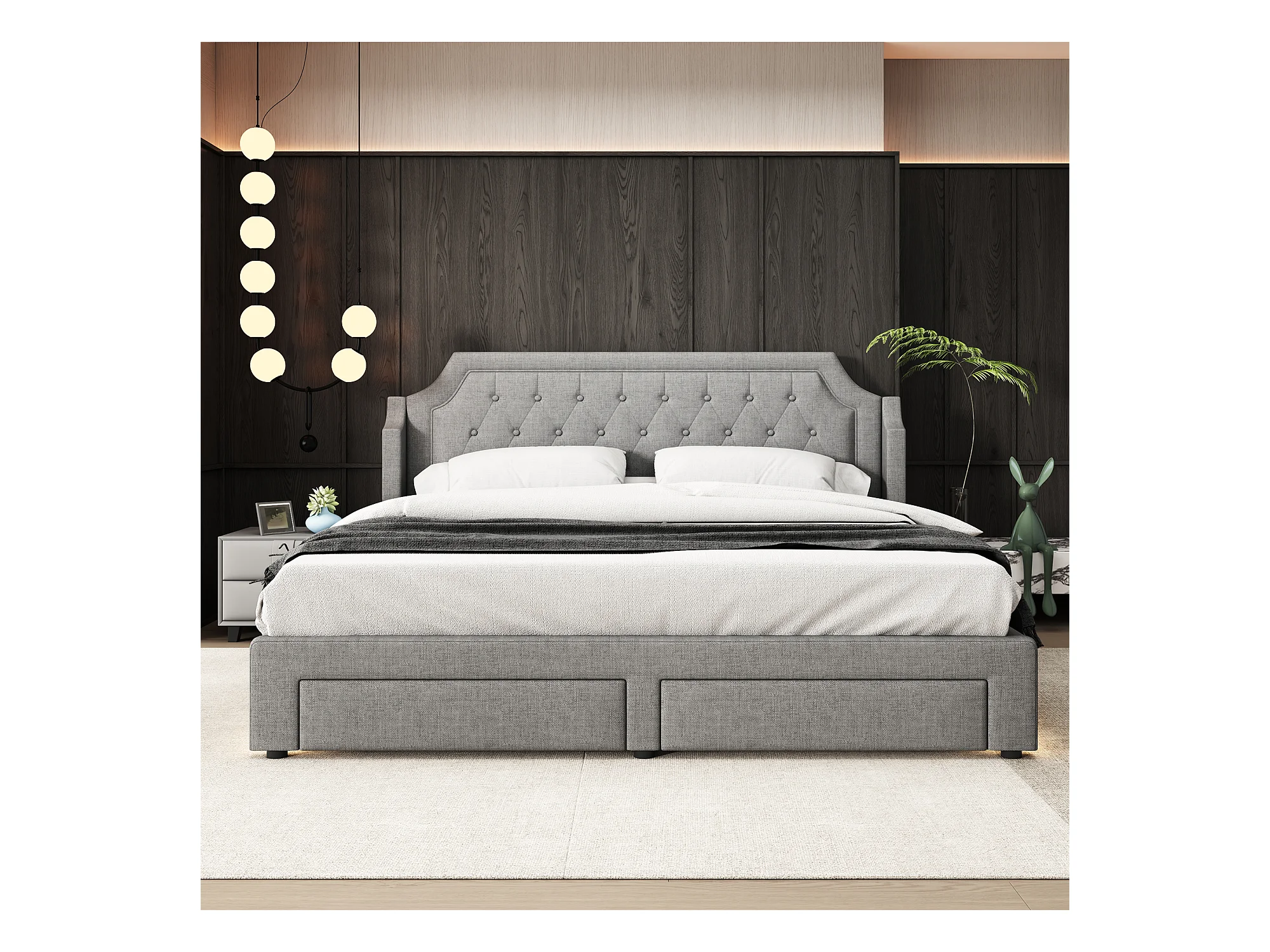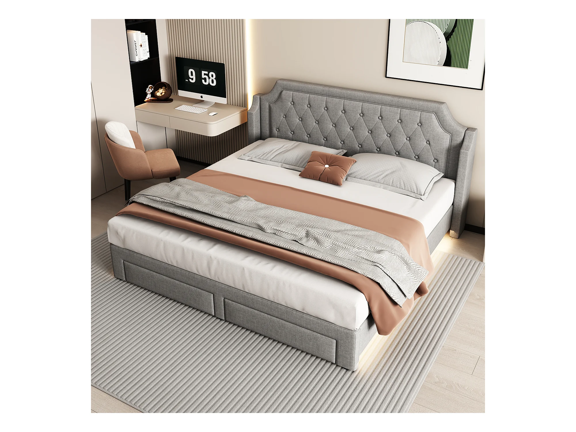Lit avec rangement, tête de lit capitonnée, velours, gris, 180x200 cm, LED, avec 2 tiroirs