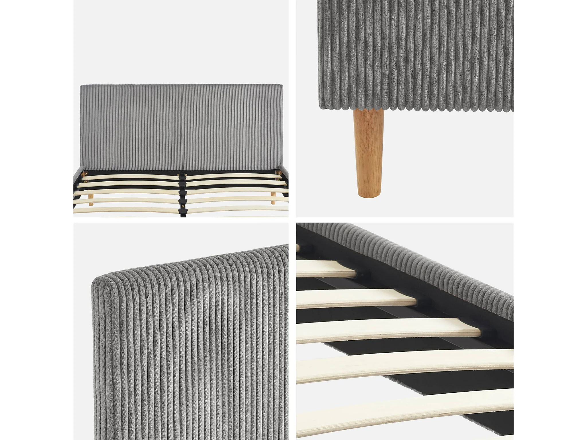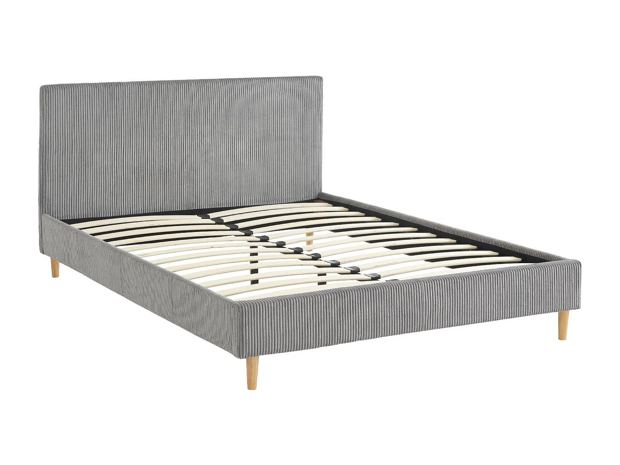 Lit avec sommier à lattes et tête de lit. L 202 x P 148 x H 89cm. gris. finition velours côtelé (grosse côte)