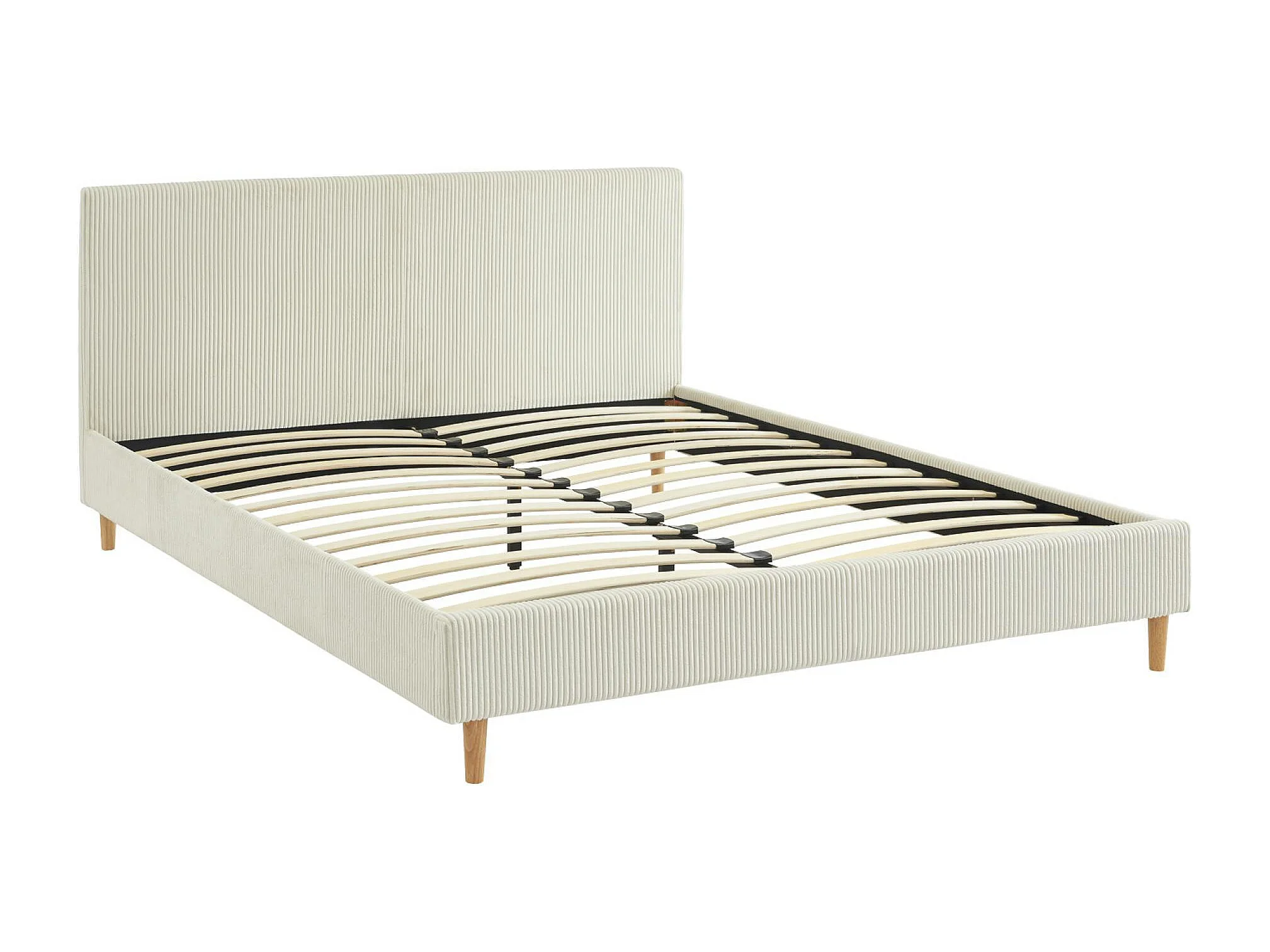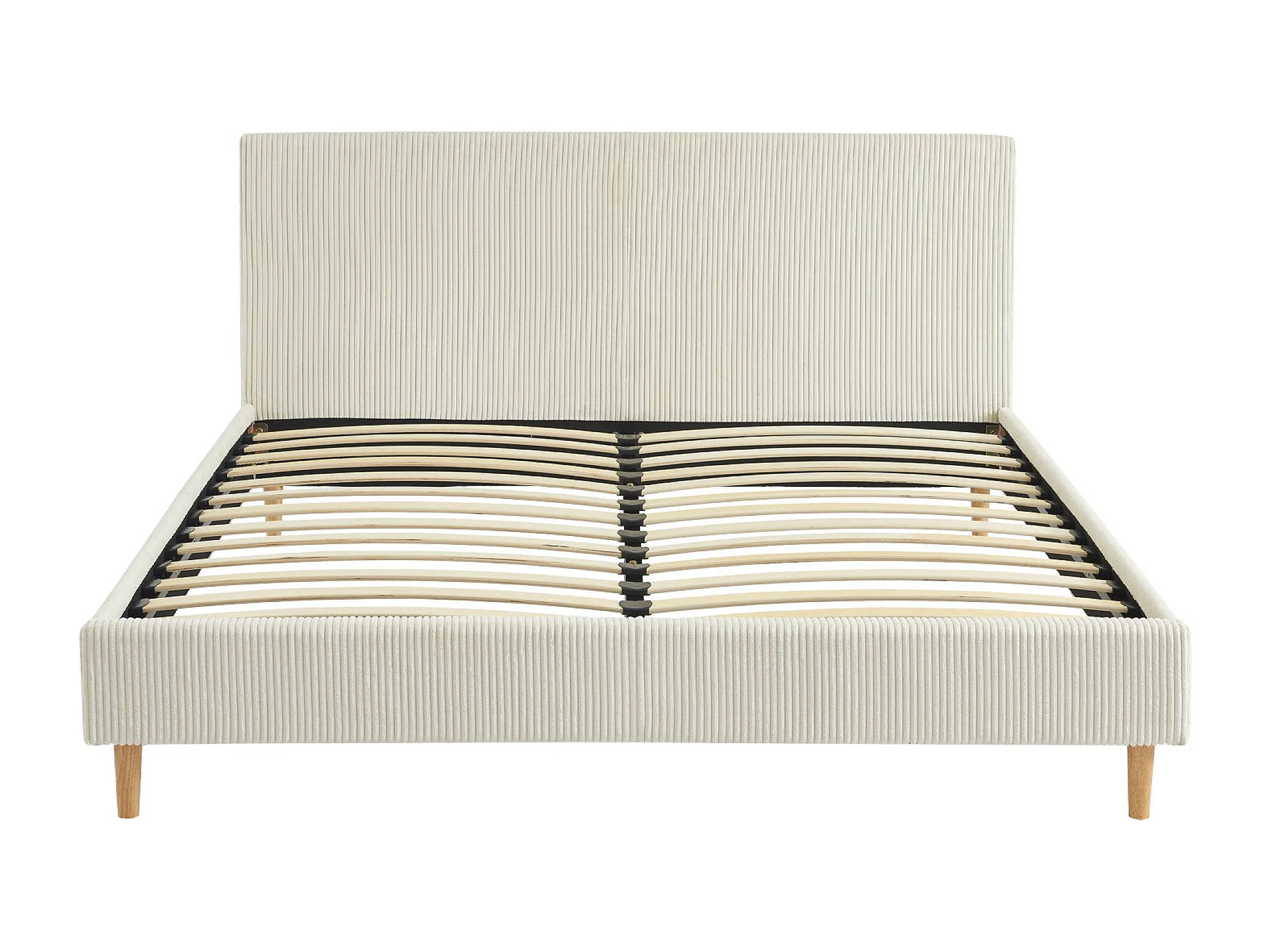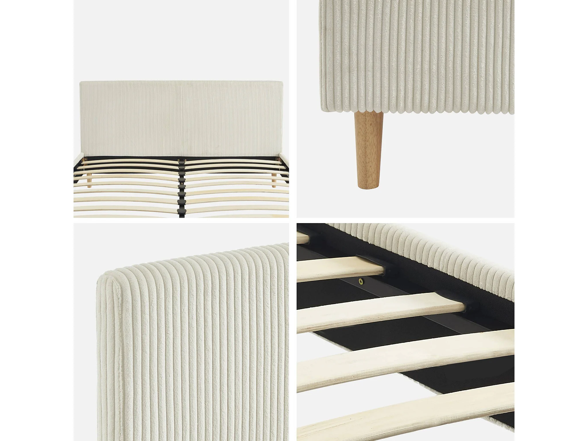 Lit avec sommier à lattes et tête de lit. L 211 x P 167.5 x H 89cm. blanc. finition velours côtelé (grosse côte)