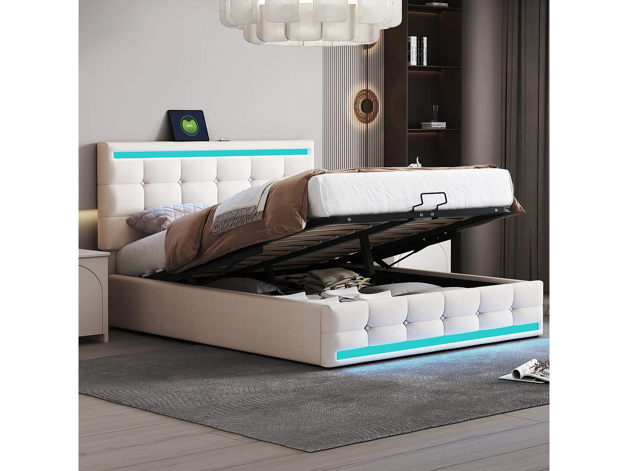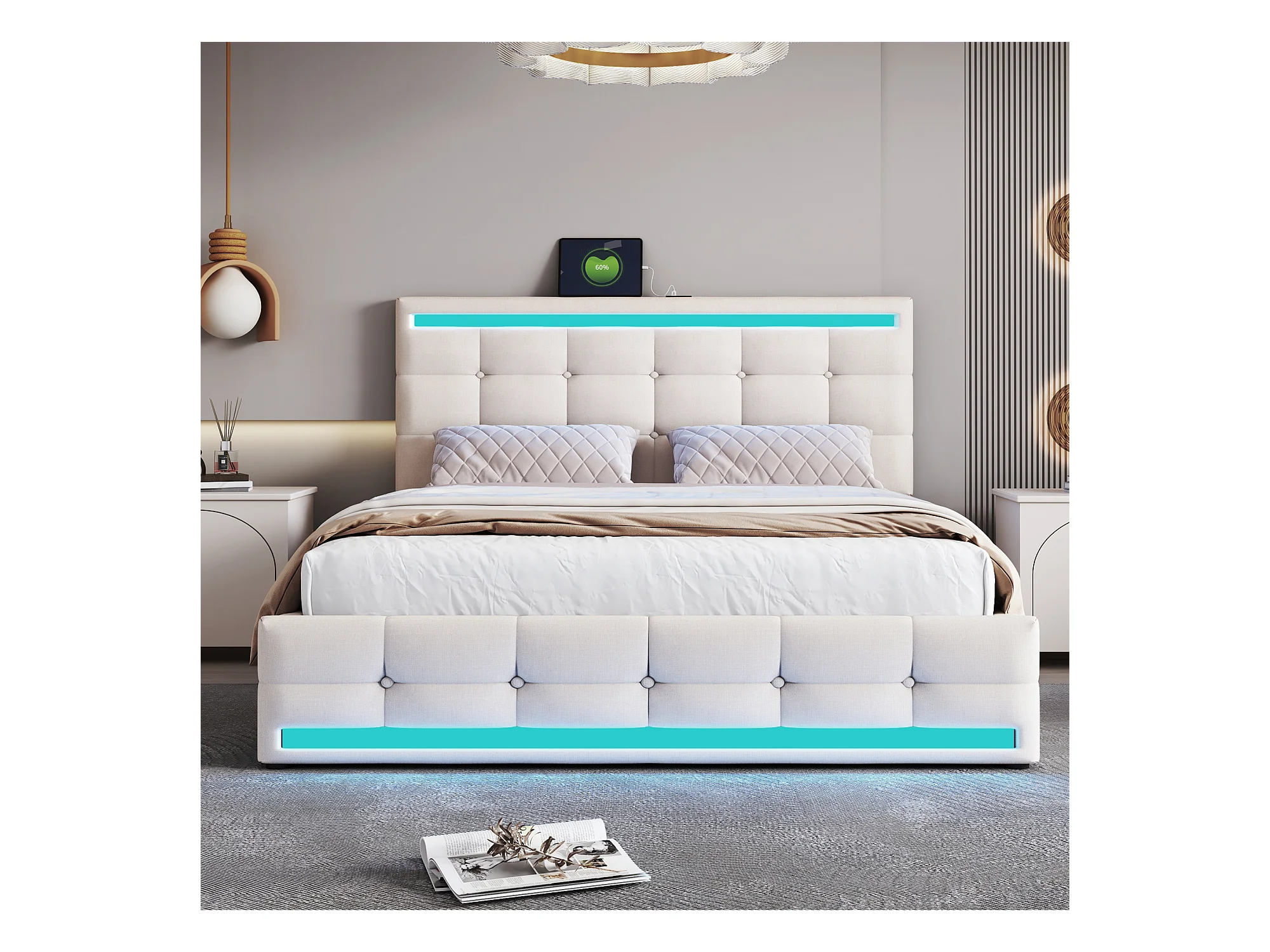 Lit avec tête de lit réglable, rangement, 2 ports USB, cadre en tissu rembourré avec LED, beige (208x145x111 cm)