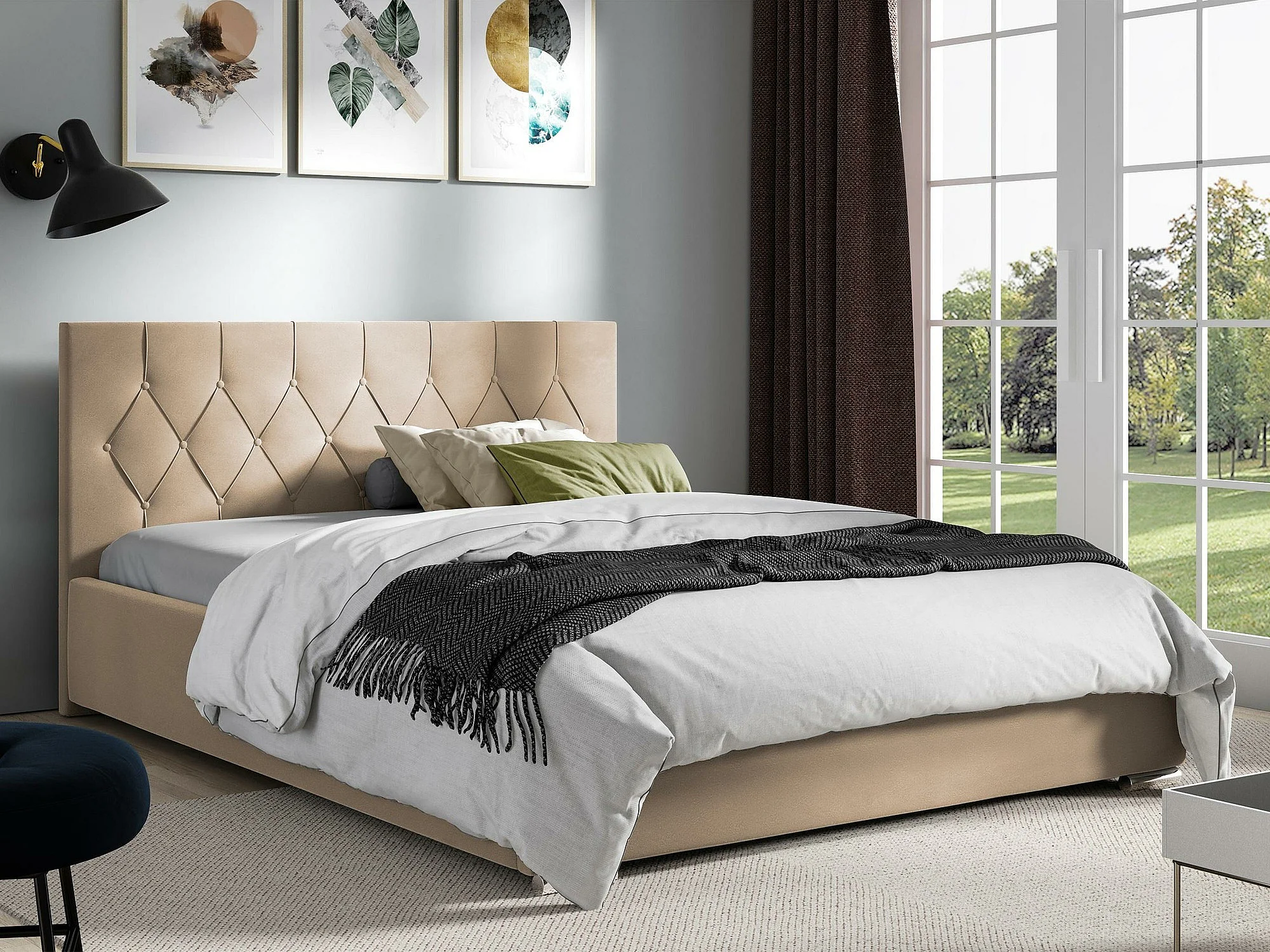 Lit Baltimore 160, Double, Brun clair, 160x200, Tapisserie, Sommier à lattes, 178x222cm