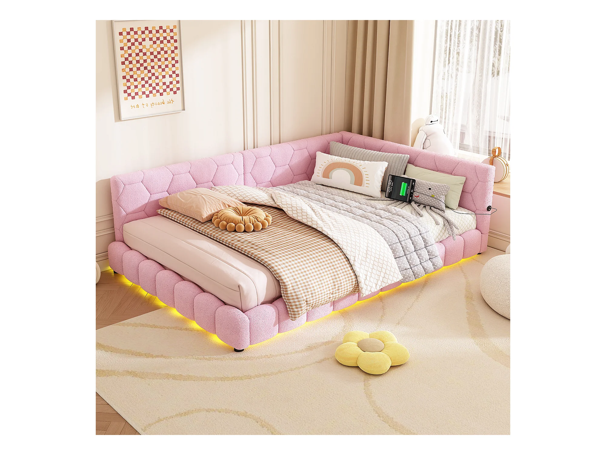 Lit banquette 140x200 cm rose avec sommier, lumière LED multicolore, ports USB et Type-C intégrés
