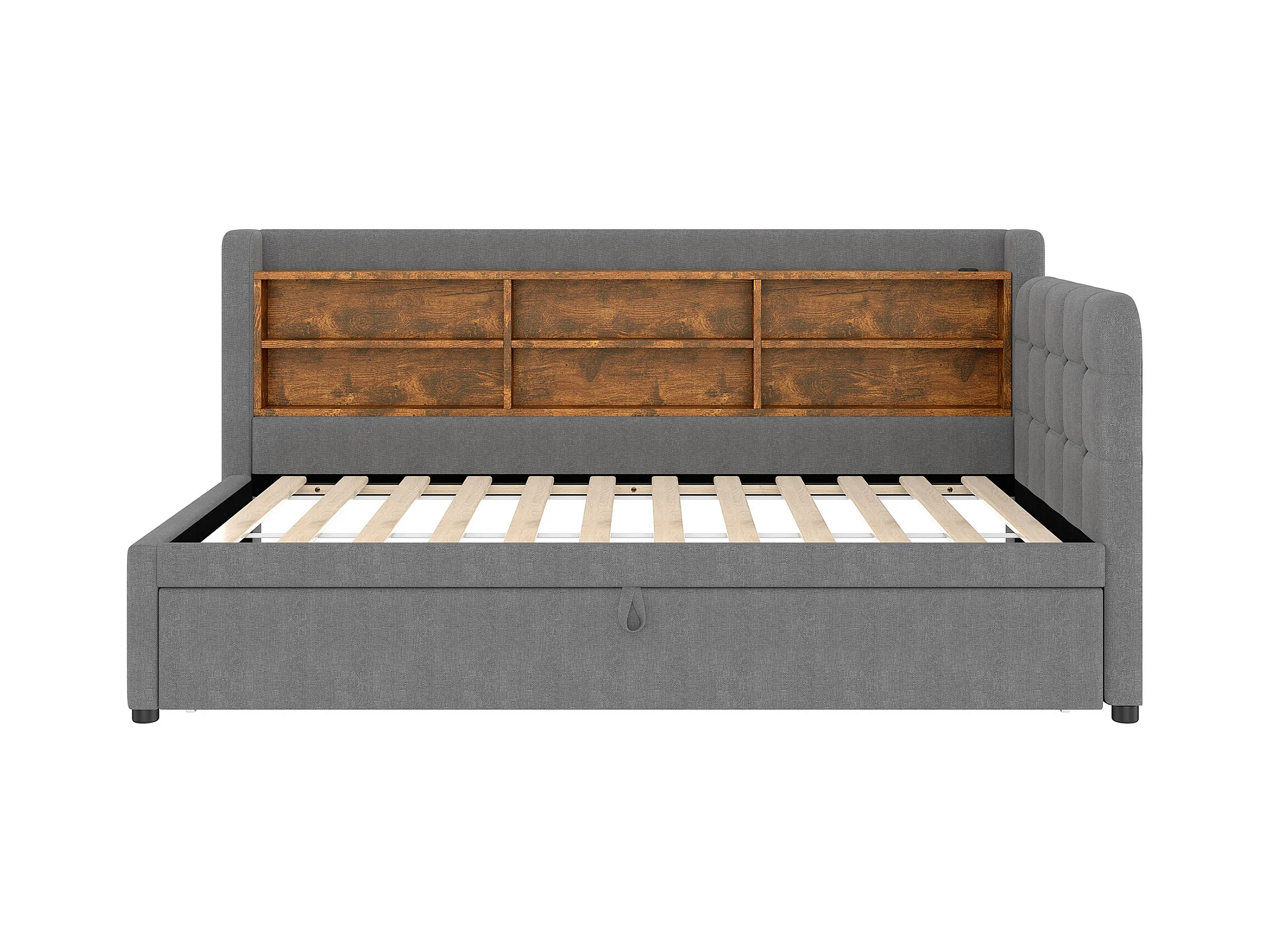 Lit banquette 90/180x200 cm, lin gris, lit gigogne avec rangement de rangement et port USB - sans matelas