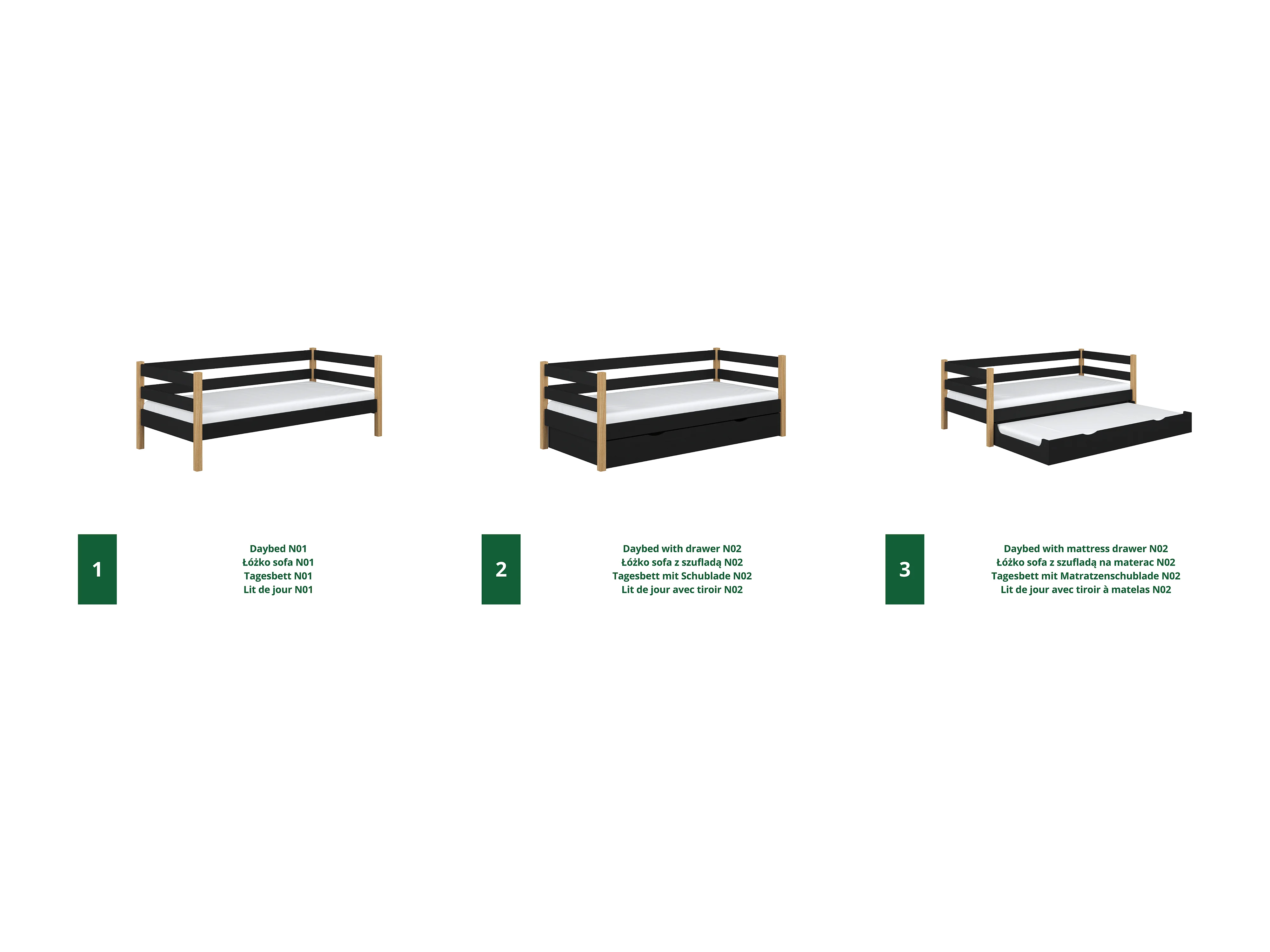 Lit banquette en bois - avec tiroir N01 Noir / Chêne Naturel 120x180