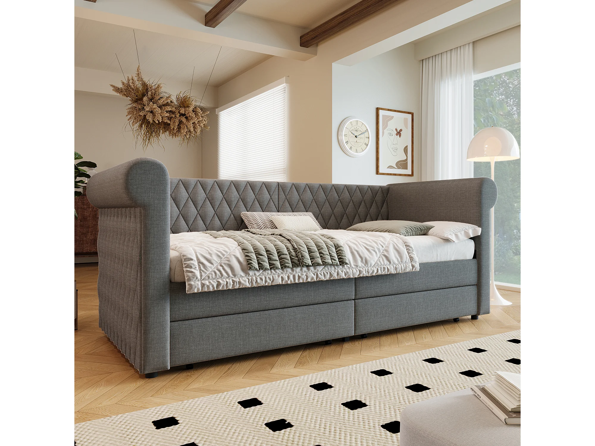 Lit banquette vintage 90×200 cm, canapé-lit avec tête de lit capitonnée et 2 tiroirs de rangement, lin gris, sans matelas