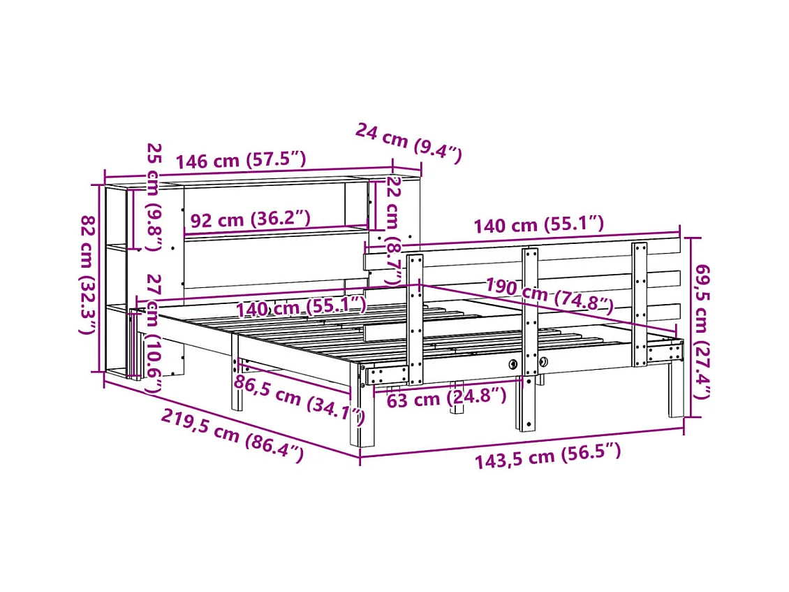 Lit bibliothèque sans matelas 140x190 cm bois de pin massif