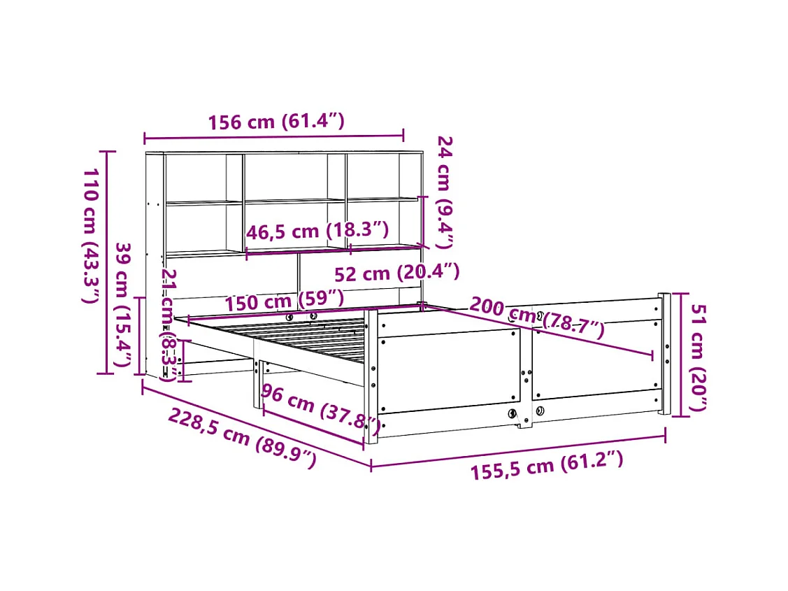 Lit bibliothèque sans matelas 150x200 cm bois massif de pin