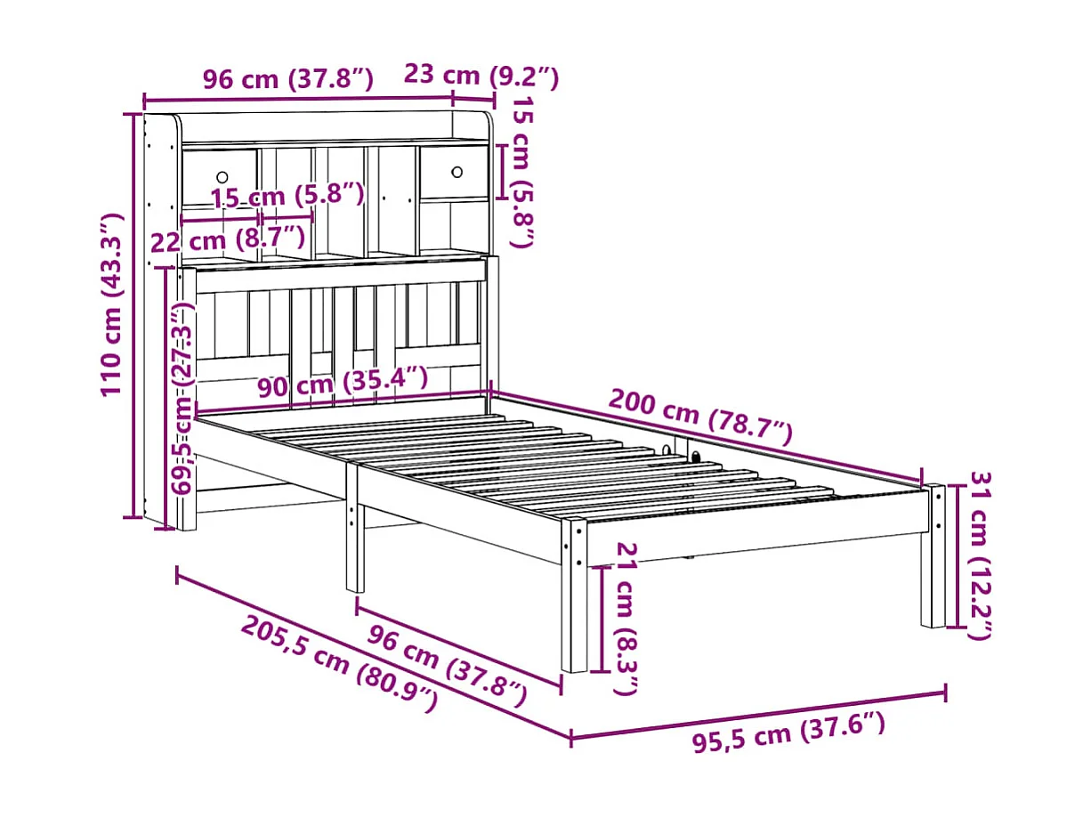 Lit bibliothèque sans matelas blanc 90x200cm bois de pin massif