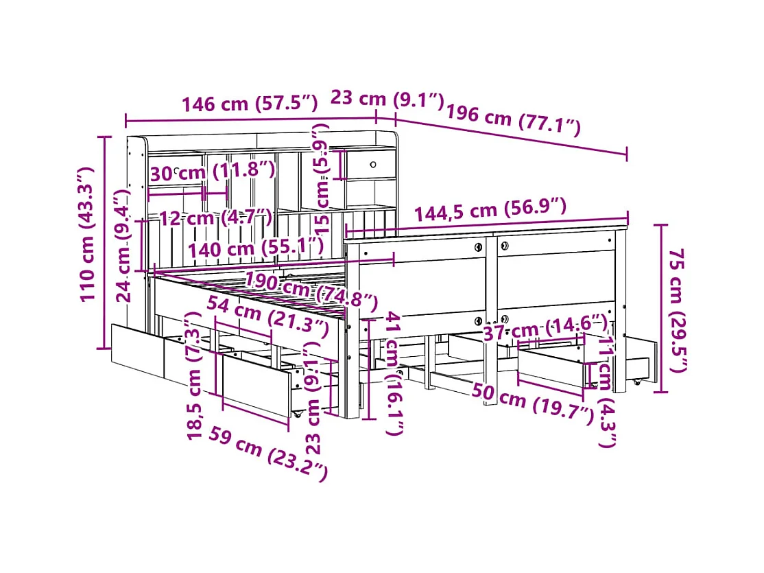 Lit bibliothèque sans matelas cire marron 140x190 cm pin massif