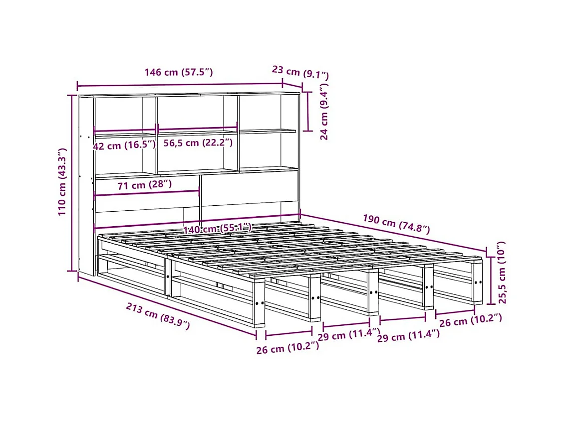 Lit bibliothèque sans matelas cire marron 140x190cm bois massif
