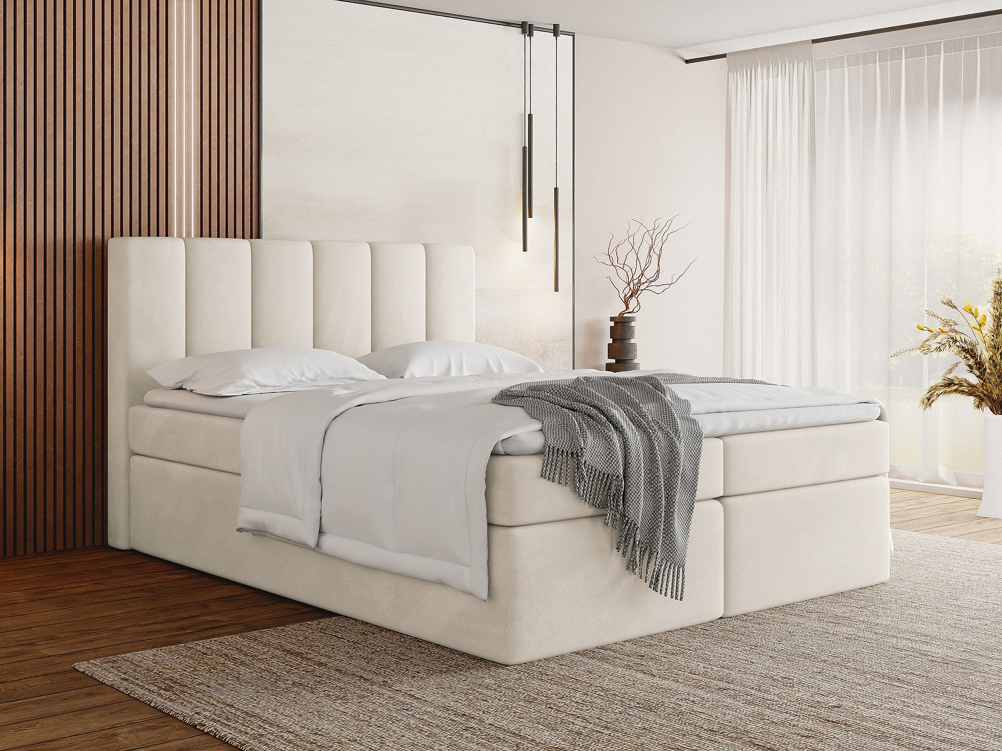 Lit Boxspring Amira 120x200 avec Matelas, Surmatelas et Coffre – Lit Coffre Tissu Velours Beige – Tête Capitonnée – Lit Double Adulte – Crème