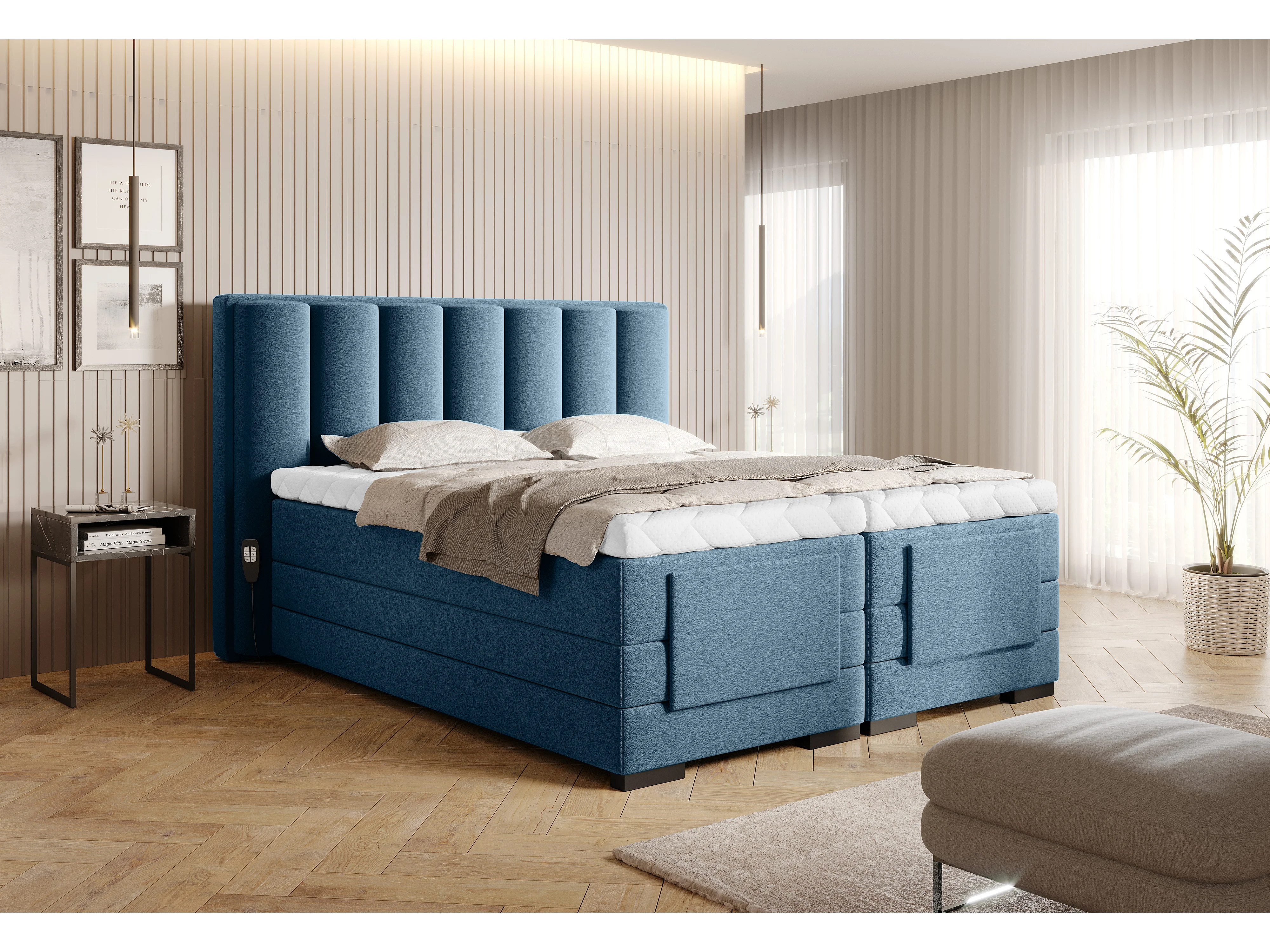 Lit boxspring électrique tissu bleu canard avec matelas et surmatelas Arkos-90x200