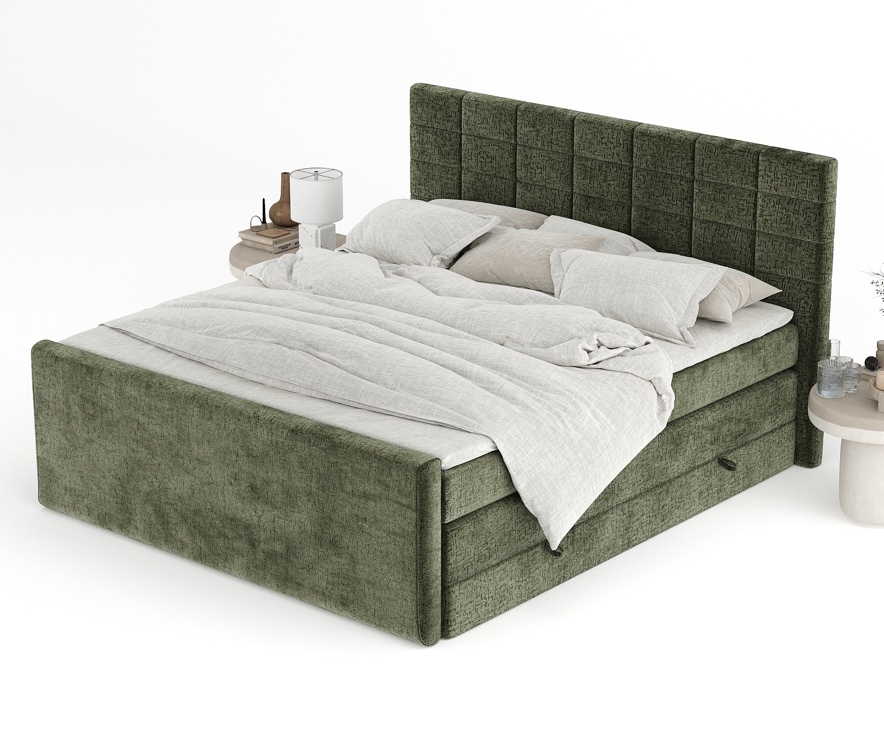 Lit boxspring en tissu chenille Ava - matelas - surmatelas - 200x200 cm - vert olive