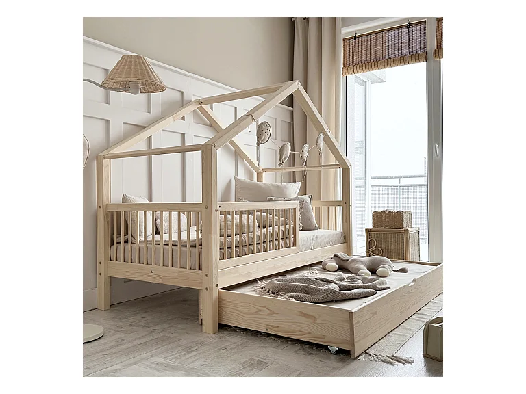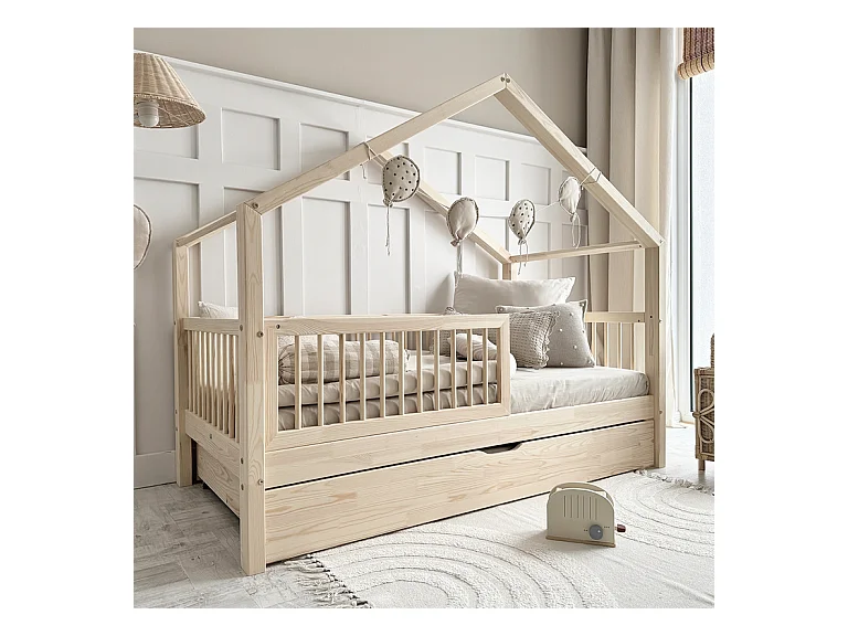 Lit cabane 90x190 barrière sommier et tiroir inclus Rosalie Bois
