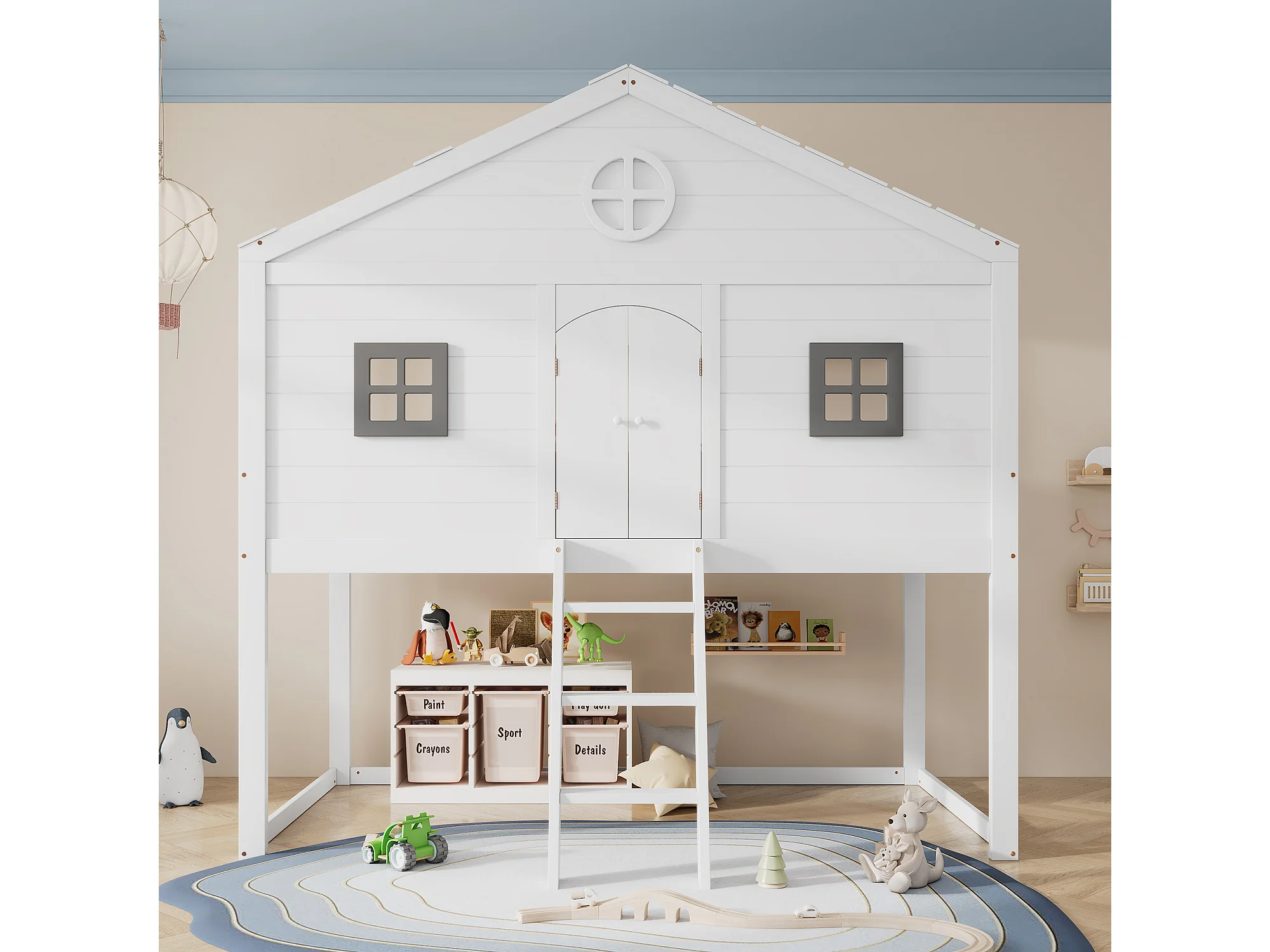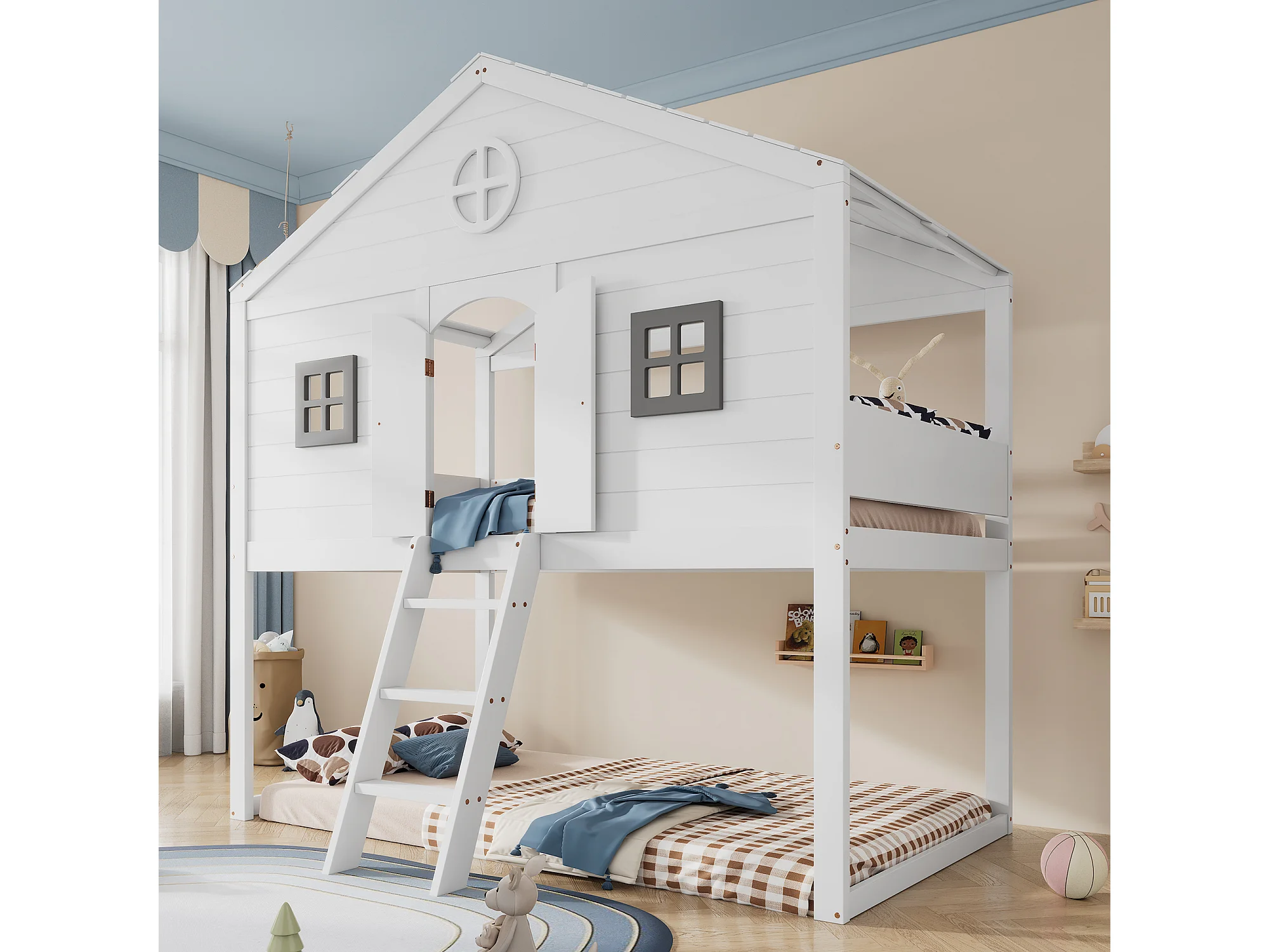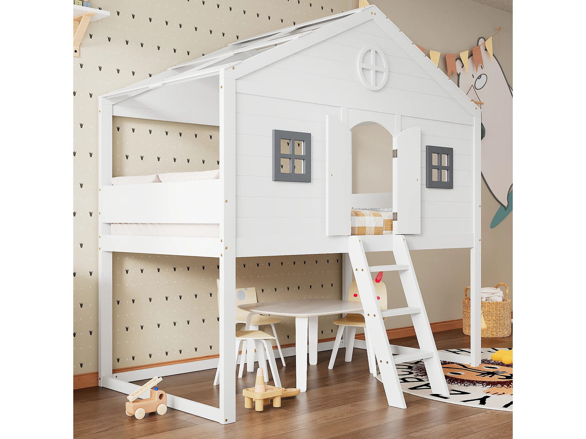 Lit cabane avec échelle, barrières de sécurité, fenêtres grises, sous-lits libres, cadre en pin, blanc + gris, 90x200cm
