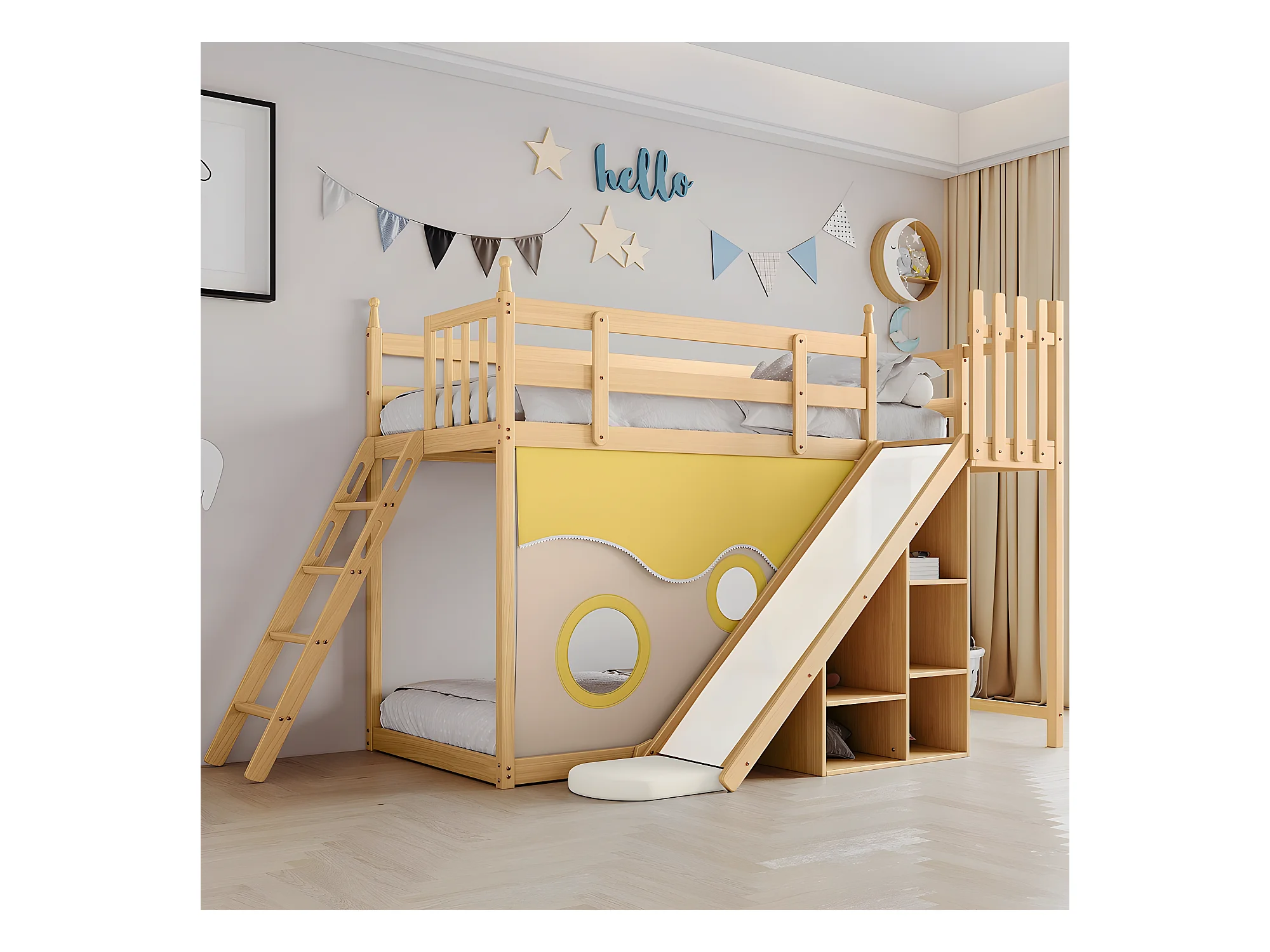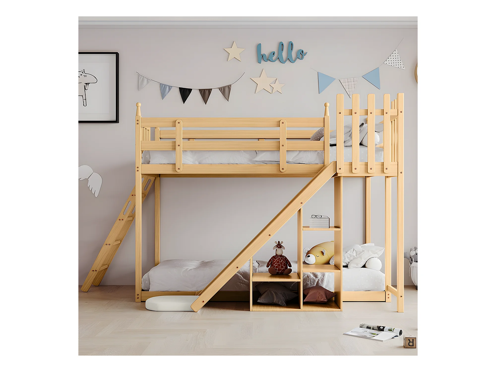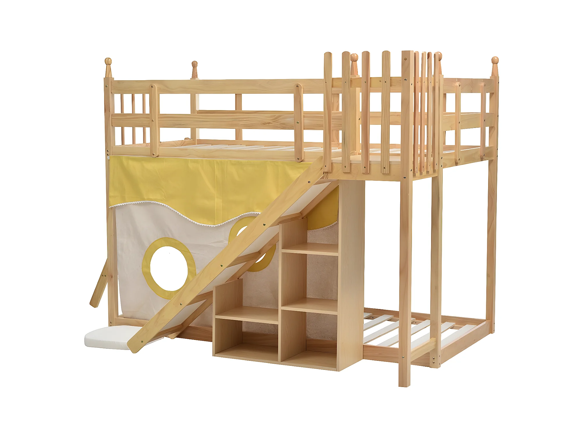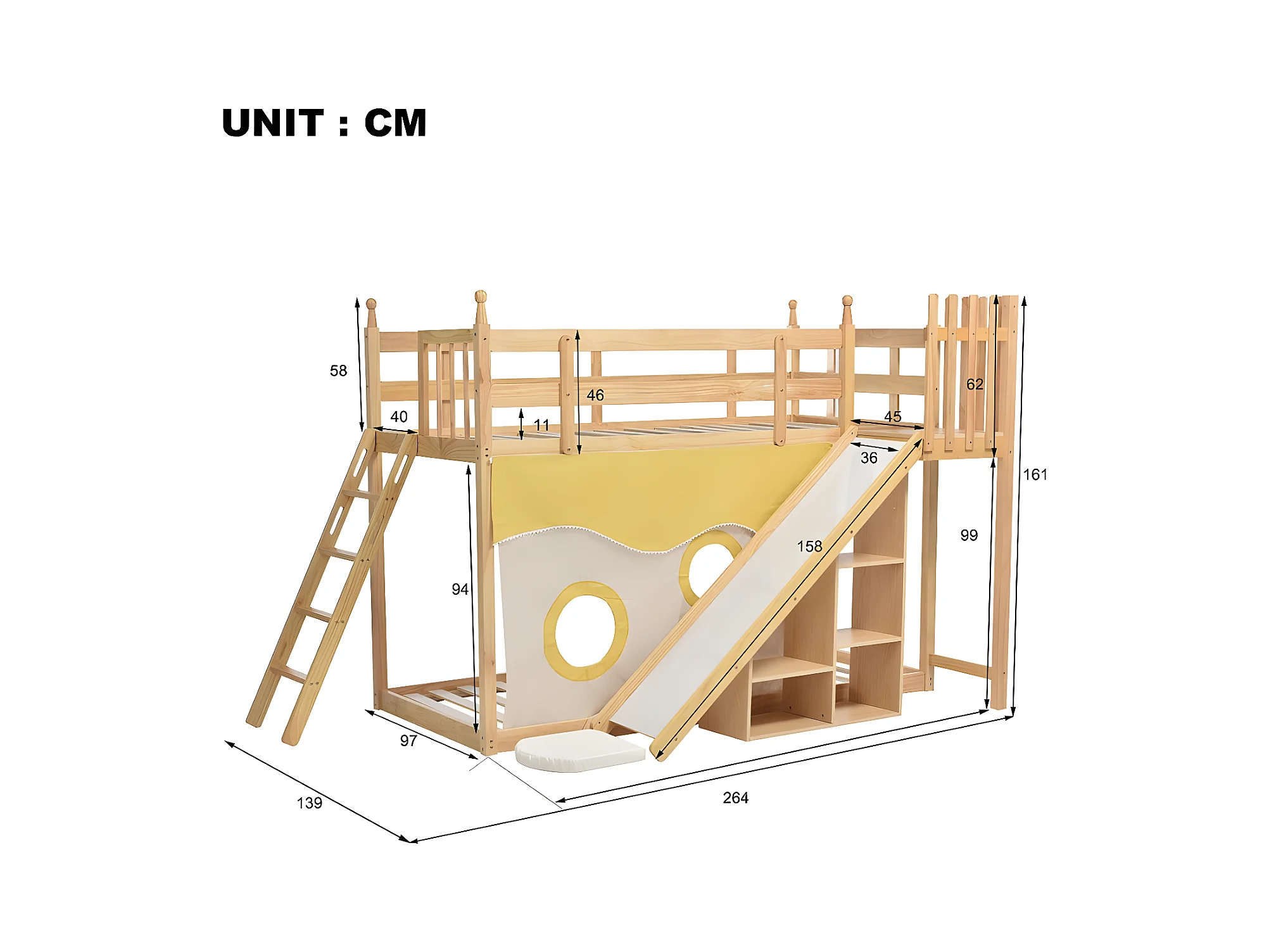 Lit cabane avec rideau de lit, toboggan et étagère, Naturel 90x200 cm - Sweiko
