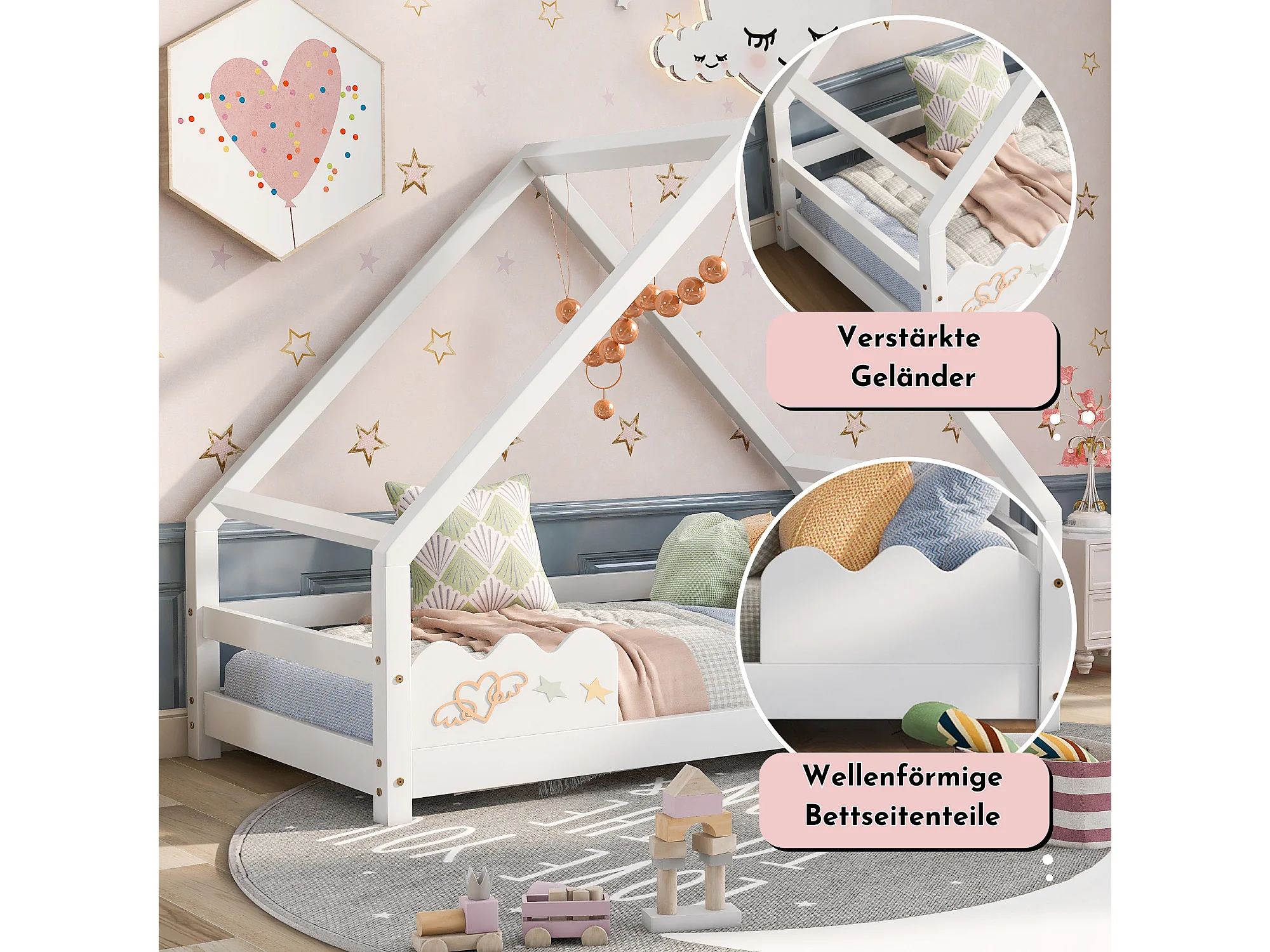 Lit cabane Lit enfant 90x200 cm avec protection anti-chute, certifié FSC, sommier, bois blanc, sans matelas