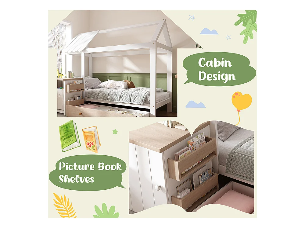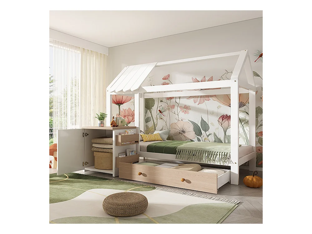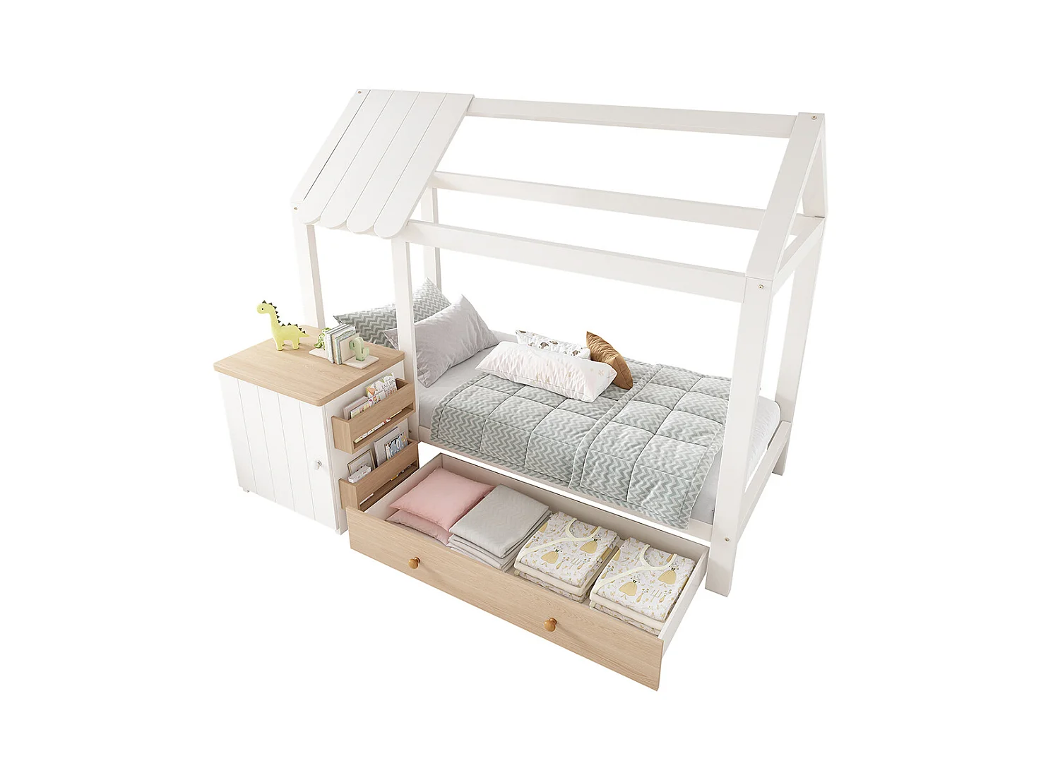 Lit cabane pour enfant 90x200 en bois massif avec tiroirs et table de chevet amovible lit au sol en blanc et blanc chêne